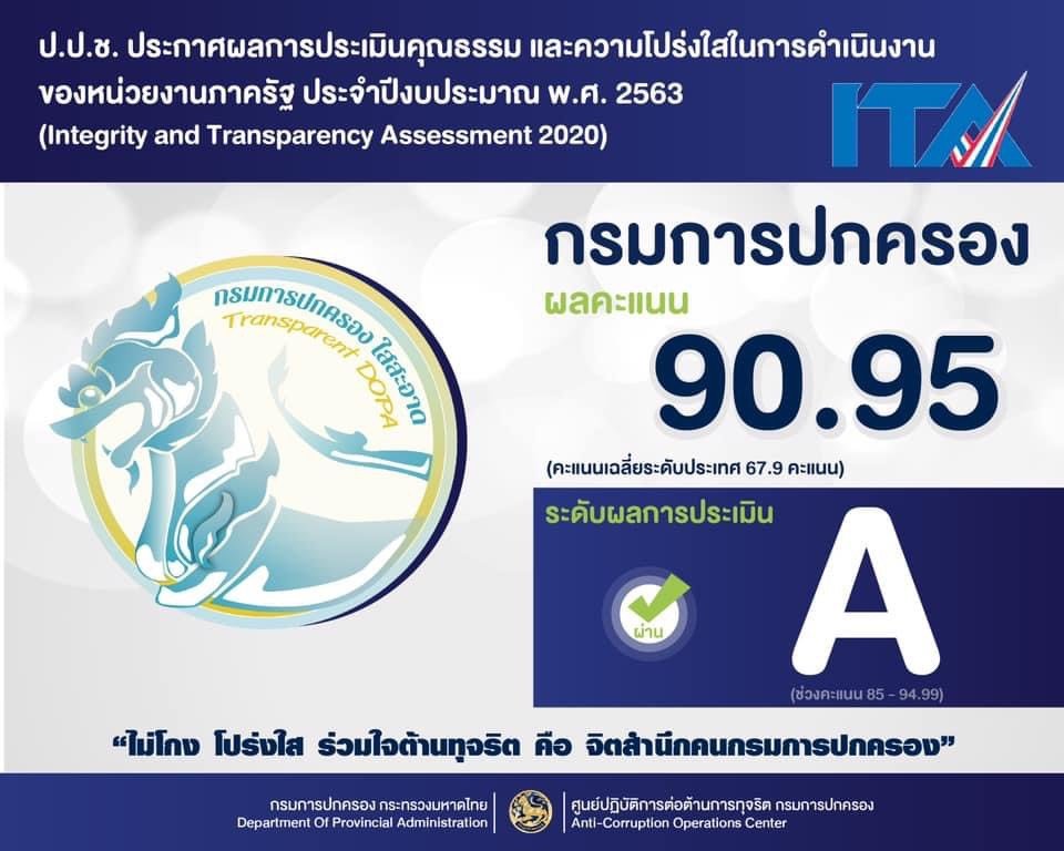 ป.ป.ช. ประกาศผลการประเมินคุณธรรมและความโปร่งใสในการดำเนินงานของหน่วยงานภาครัฐทั่วประเทศ (ITA) ประจำปีงบประมาณ 2563 กรมการปกครองได้ผลการประเมิน 90.95 คะแนนอยู่ในระดับ A