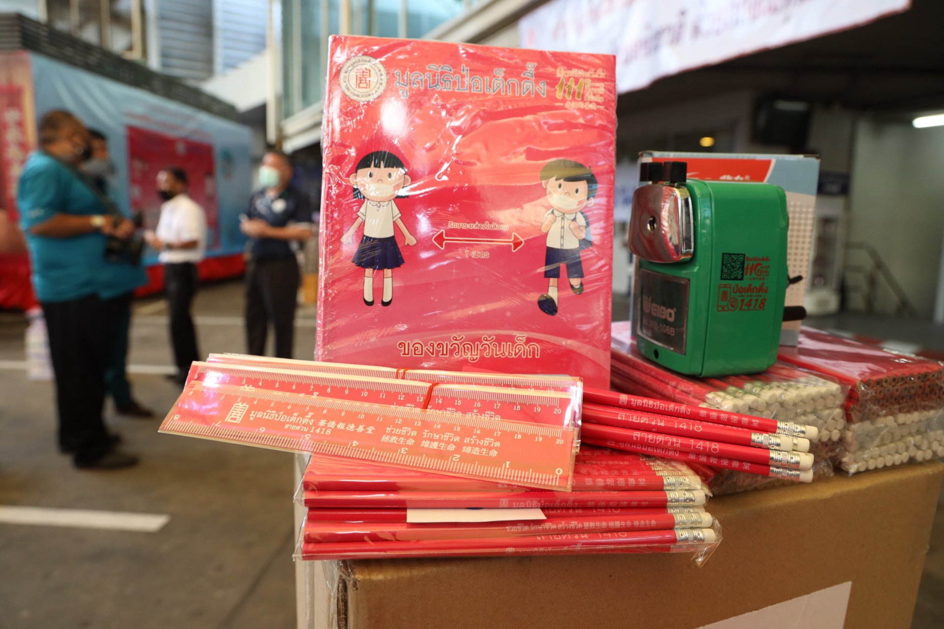 โดยมีผู้แทนโรงเรียนเป็นผู้รับมอบ รวมทั้งจัดให้มีการส่งชุดของขวัญวันเด็กของมูลนิธิฯ เพื่อมอบให้กับเยาวชนในส่วนภูมิภาคทั่วประเทศ ตลอดจนหน่วยงานต่างๆ ทั้งในส่วนกลางและส่วนภูมิภาคทุกจังหวัด รวมมูลนิธิป่อเต็กตึ๊ง มอบชุดของขวัญวันเด็กแก่เยาวชน เนื่องในวันเด็กแห่งชาติประจำปี 2564 รวมจำนวน 5,400,000 ชิ้น พร้อมมอบเครื่องเหลาดินสอแก่โรงเรียนต่างๆ รวมจำนวน 3,720 เครื่อง คิดมูลค่าเป็นเงินไม่ต่ำกว่า 32.8 ล้านบาท โดยมีอาสาสมัคร และอาสาฯ ศิลปิน นำโดยนายกวินรัฎฐ์ ยศอมรสุนทร (หยวน) และนายอชิต ธีรวิทยตระกูล (อู๊ด-เป็นต่อ) ร่วมแจกจ่ายชุดเครื่องเขียนในวันนี้ รวมทั้งมูลนิธิฯได้จัดให้มีมาตรการตรวจวัดอุณหภูมิทั้งสองฝั่ง และขอความร่วมมือผู้ร่วมงานสวมหน้ากากอนามัยตลอดเวลา เพื่อป้องกันการแพร่ระบาดของเชื้อไวรัส โควิด-19