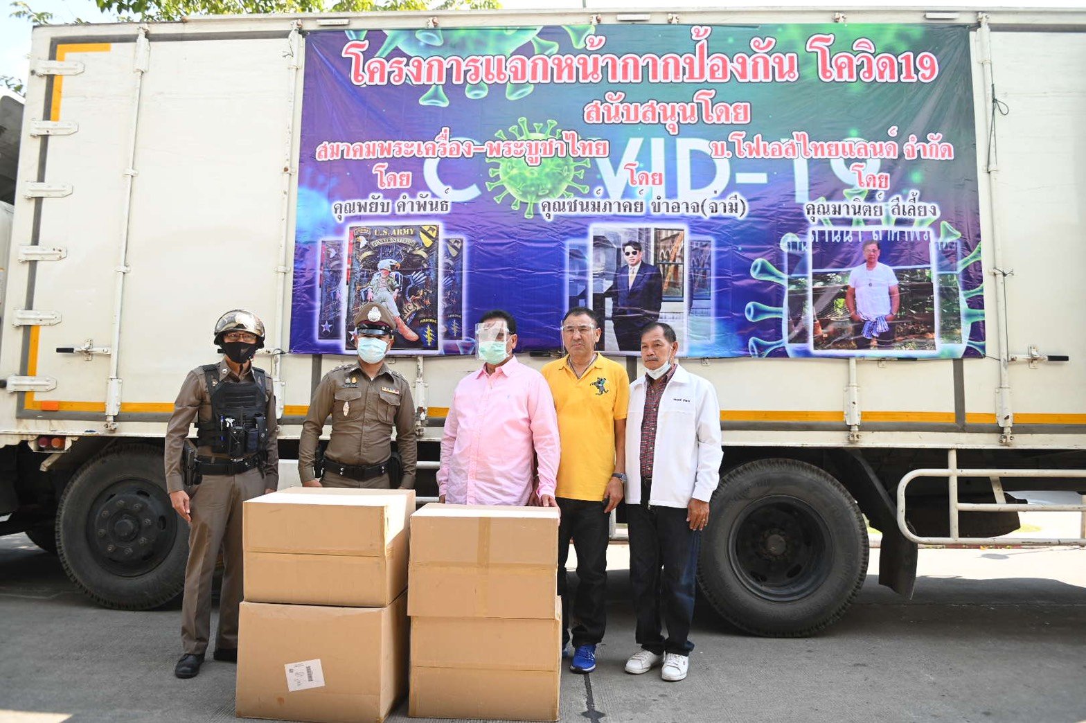โดยการบริจาคในครั้งนี้เป็นการร่วมมือกัน ดังนี้นายมานิตย์ สีเลี้ยง บริษัทโฟรเอส ไทยแลนด์ จำกัด พร้อมด้วย นายพยัพ คำพันธ์ นายกสมาคมพระเครื่องพระบูชา แห่งประเทศไทย และนายชนม์ภาคย์ ขำอาจ (จ่ามี) พ.ต.อ.พิทักษ์ เอียงอุบล นายนุกูล หรือเป็กโก้ เสืองามเอี่ยม อ็อด โฟรเอส และศิลปินนักร้องบริษัทโฟรเอส ไทยแลนด์ จำกัด ร่วมกันบริจาคและมอบ Face Shield