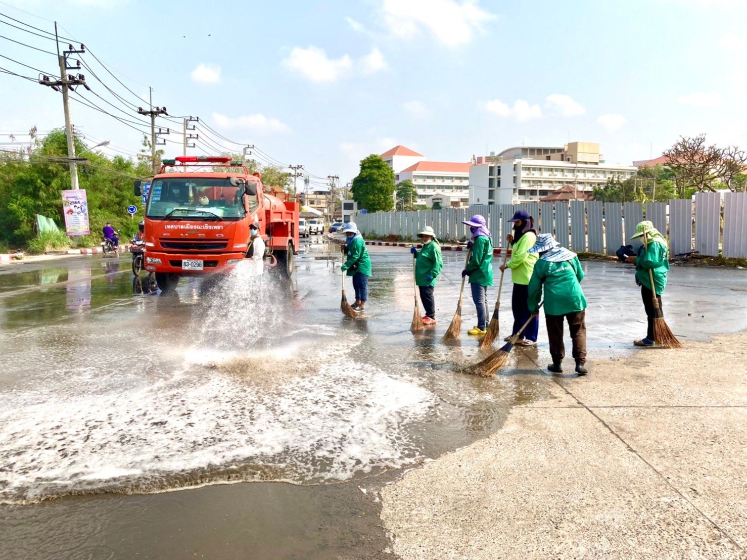 ล้างถนนทำความสะอาดเมือง...ทม.ฉะเชิงเทรา ระดมปัดกวาดฉีดล้างพื้นที่กำจัดฝุ่น PM2.5 ในเขตเมือง