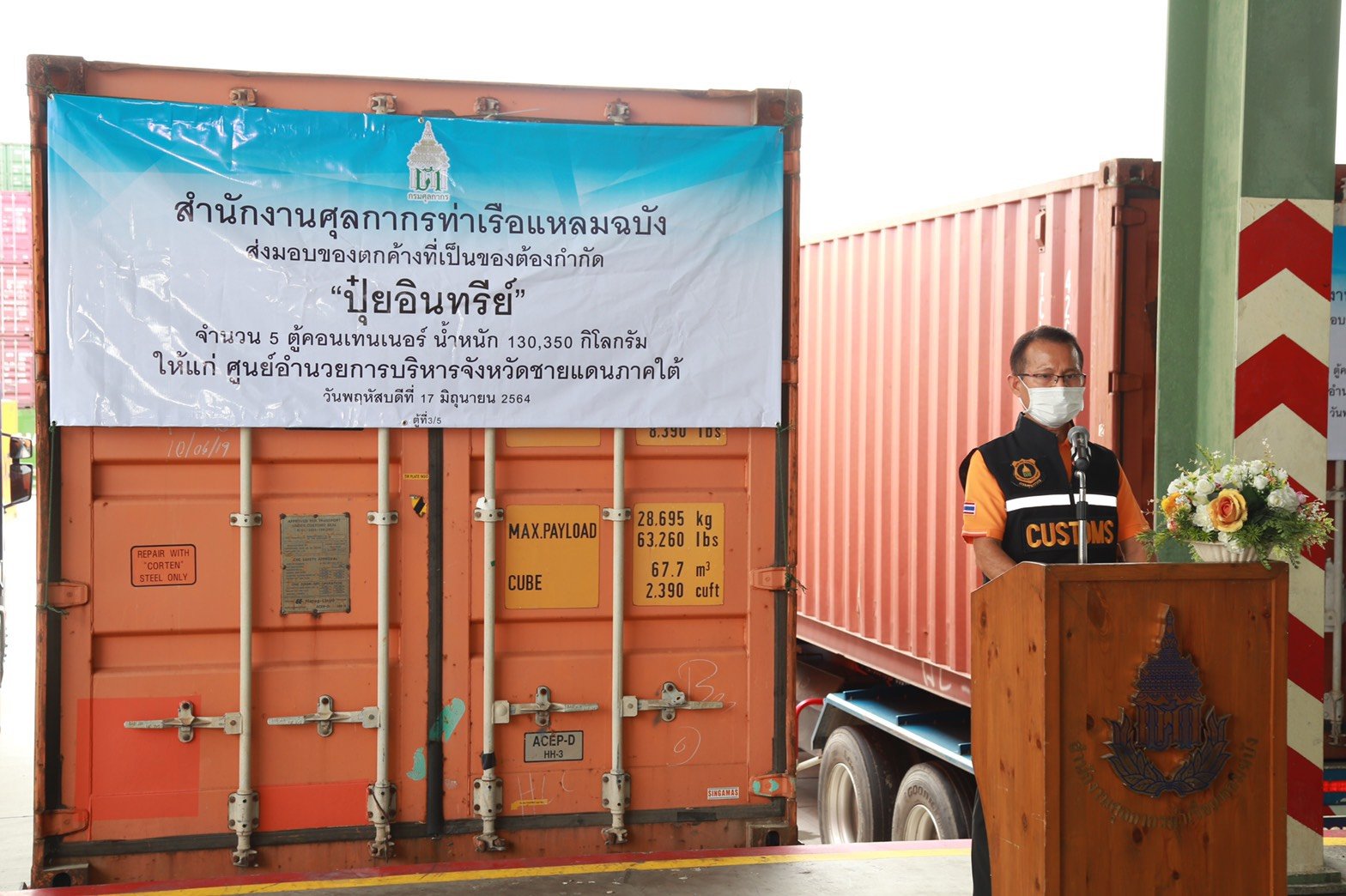 เมื่อเร็ว ๆ นี้ ที่ท่าเรือบริษัท ฮัทชิสัน พอร์ท ประเทศไทย (D1)ท่าเรือแหลมฉบัง อ.ศรีราชา จ.ชลบุรี นายถวัลย์ รอดจิตต์ ผู้อำนวยการสำนักงานศุลกากรท่าเรือแหลมฉบัง (สทบ.)พร้อมด้วยผู้บริหารและเจ้าหน้าที่ได้ส่งมอบ “ปุ๋ยอินทรีย์” (ORGANIC FERTILIZER) ซึ่งเป็นของตกค้างฯ และตกเป็นของแผ่นดิน จำนวน 5 ตู้คอนเทนเนอร์ รวมน้ำหนักทั้งสิ้น 130,350 กิโลกรัมให้แก่ศูนย์อำนวยการบริหารจังหวัดชายแดนภาคใต้ (ศอ.บต.)