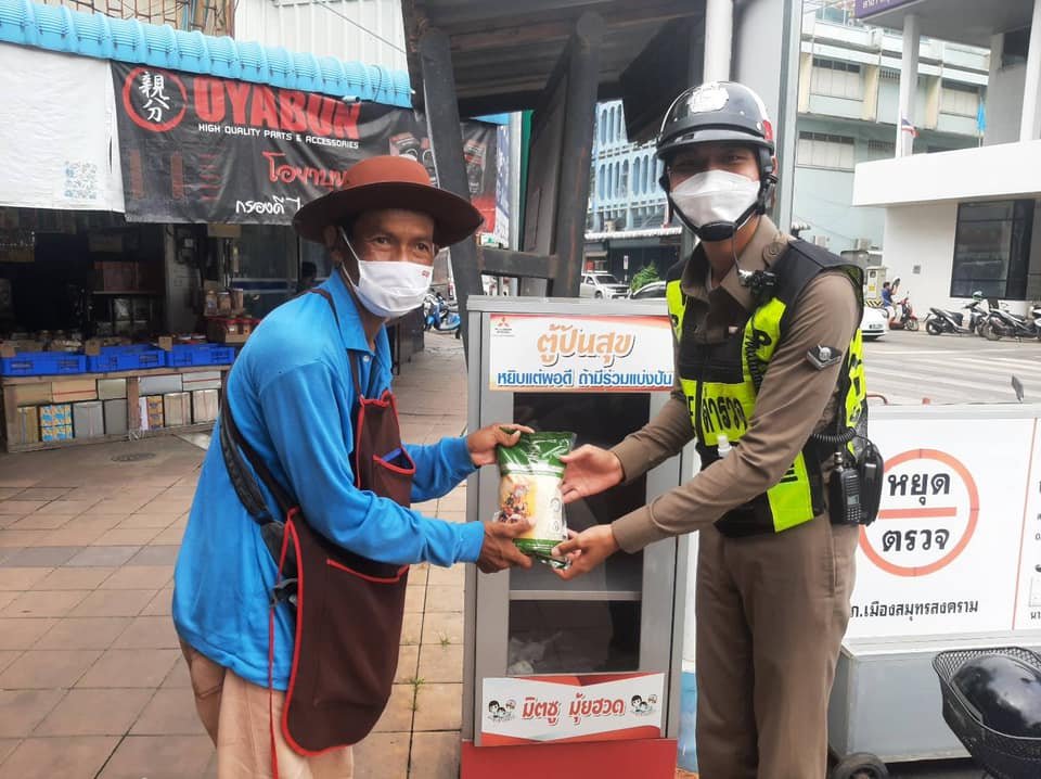 -ตู้ปันสุข...ภายใต้การอำนวยการของ พ.ต.อ.ศยาม อินทร์สุวรรณโณ ผกก.สภ.เมืองสมุทรสงคราม ส.ต.ต.ราชโยธิน คำผุย เมือง 6113 เจ้าหน้าที่ตำรวจจราจร มอบข้าวสารให้กับประชาชนที่มีความต้องการ ตามโครงการ "ตู้ปันสุข" เพื่อช่วยบรรเทาความเดือดร้อน แบ่งปันให้กับผู้ที่ขาดแคลนในสภาวะวิกฤตการแพร่ระบาดของโรคโควิด-19 บริเวณศูนย์จราจร ตลาดแม่กลอง อ.เมืองสมุทรสงคราม!!