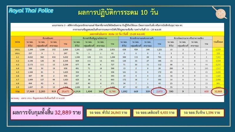 รอง ผบ.ตร. กล่าวอีกว่า ศจร.ตร. ได้เริ่มมาตรการดังกล่าวตั้งแต่ 15 พ.ย.64เป็นต้นมา โดยกำหนดให้มีการระดมการบังคับใช้กฎหมายอย่างเข้มข้นครั้งแรกในวันที่ 15-24 พ.ย.2564 รวม 10 วัน สามารถจับกุมผู้กระทำผิด ดังนี้ 1.ขับรถย้อนศร 20,671 ราย แบ่งเป็นรถ จยย.ทั่วไป 17,469 ราย รถ จยย.เดลิเวอรี่ 2,283 ราย และรถ จยย.สาธารณะ 919 ราย 2.ขับรถฝ่าฝืนสัญญาณไฟจราจร 8,748 ราย แบ่งเป็น รถ จยย.ทั่วไป 6,914 ราย รถ จยย.เดลิเวอรี่ 1,494 ราย และรถ จยย.สาธารณะ 340 ราย 3.ขับรถรถจักรยานยนต์บนทางเท้า 2,870 ราย แบ่งเป็นรถ จยย.ทั่วไป 1,892 ราย รถ จยย.เดลิเวอรี่ 669 ราย และ รถ จยย.สาธารณะ 309 ราย 4.ขับรถโดยประมาทหรือน่าหวาดเสียว 600 ราย แบ่งเป็นรถ จยย.ทั่วไป 590 ราย รถ จยย.เดลิเวอรี่ 9 ราย และรถ จยย.สาธารณะ 1 ราย