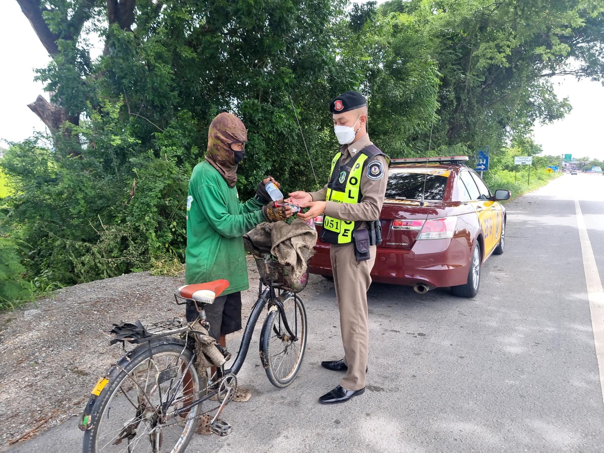 ไล่เลี่ยกันไม่นาน ตำรวจทางหลวงพระแท่น ออกตรวจพื้นที่รับผิดชอบ ทล.346 กม.ที่ 110+700 พบประชาชนนั่งอยู่ริมถนน จึงได้เข้าไปสอบถาม ทราบว่ามานั่งพักหลบแดดเพราะรู้สึกจะเป็นลมจากการปั่นจักรยานหาเก็บขวดริมทางไปขายเพื่อประทังชีวิตยังไม่ได้กินข้าวเช้า โดยความเป็นห่วงเจ้าหน้าที่จึงมอบน้ำดื่ม และขนมปังไว้ให้กินระหว่างนั่งพัก และเดินทางต่อไปได้อย่างปลอดภัย.
