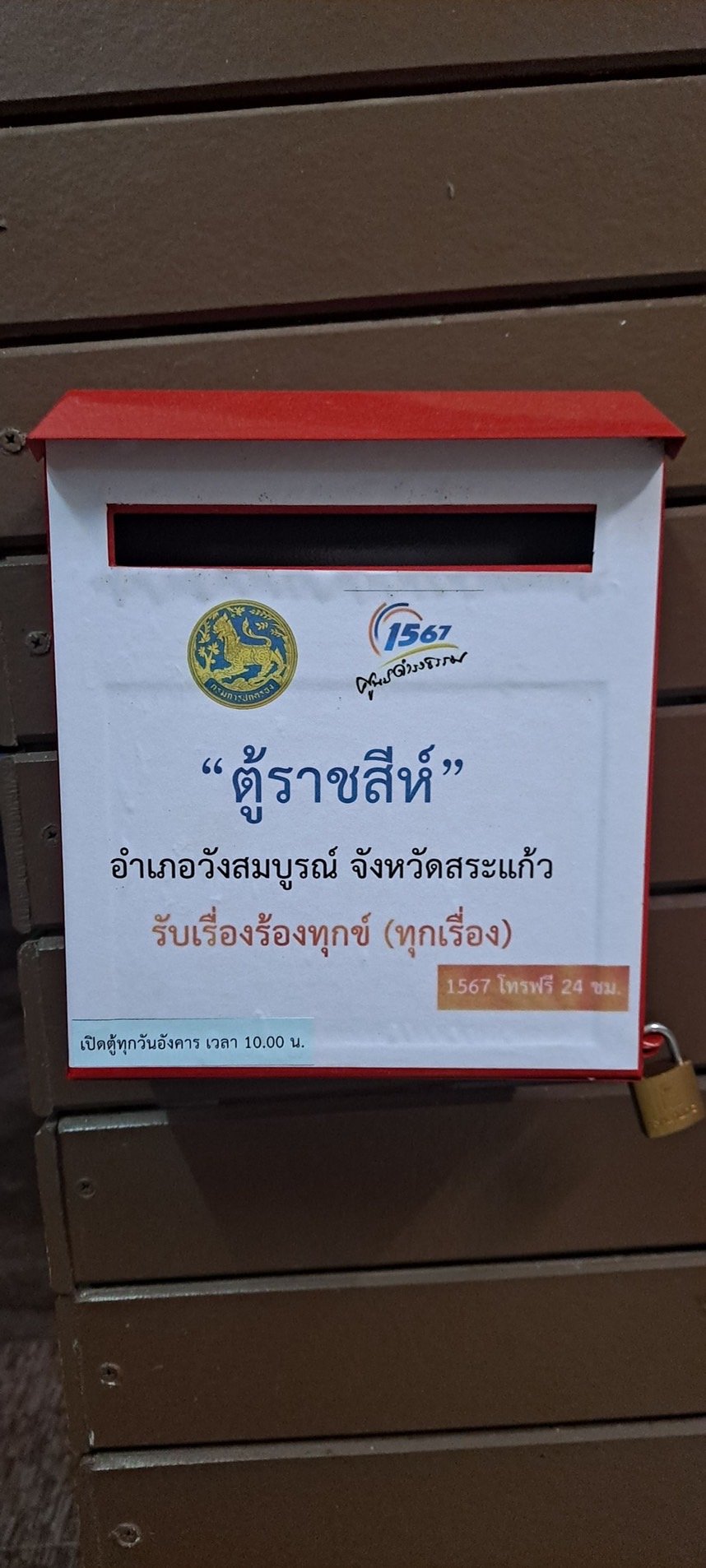 วานนี้ (28 มิ.ย.)ภายใต้นโยบายของนายธนาคม จงจิระ อธิบดีกรมการปกครอง ได้สั่งการให้ทุกอำเภอติดตั้งตู้ราชสีห์เพื่อเป็นอีกหนึ่งช่องทางในการรับเรื่องร้องเรียนร้องทุกข์ของพี่น้องประชาชนในพื้นที่ โดยนายแนายอำเภอวังสมบูรณ์/ผู้บังคับกองอาสารักษาดินแดนอำเภอวังสมบูรณ์ ที่ 10 จ.สระแก้ว ไดสั่งการให้ติดตั้งตู้ราชสีห์ในพื้นที่อำเภอวังสมบูรณ์จำนวน 3 ตู้
