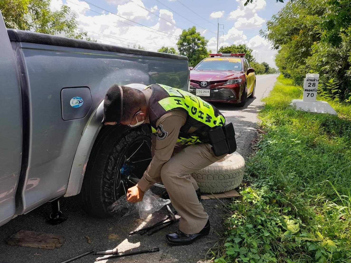ด้านตำรวจทางหลวงด่านช้าง จ.สุพรรณบุรี ให้การช่วยเหลือประชาชน โดยรถวิทยุ 2604 ออกตรวจพบรถยนต์ส่วนบุคคลยางล้อหลังด้านซ้ายระเบิด จอดอยู่บริเวณไหล่ทางหลวง 333 กม.36 มุ่งหน้าสระกระโจม อ.ดอนเจดีย์ จ.สุพรรณบุรี จึงได้ดำเนินการให้ความช่วยเหลือถอดเปลี่ยนใส่ยางอะไหล่ให้จนสามารถเดินทางต่อไปได้