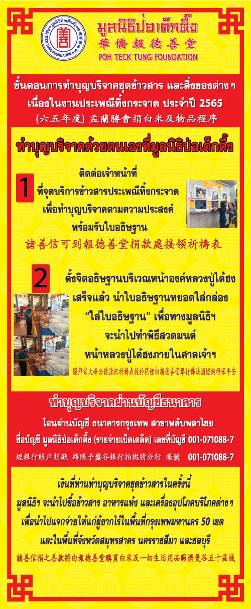 ติดต่อสอบถามข้อมูลเพิ่มเติม หรือติดตามข่าวสารและกิจกรรมของมูลนิธิป่อเต็กตึ๊งได้ที่ Facebook Fanpage : www.facebook.com/atpohtecktung