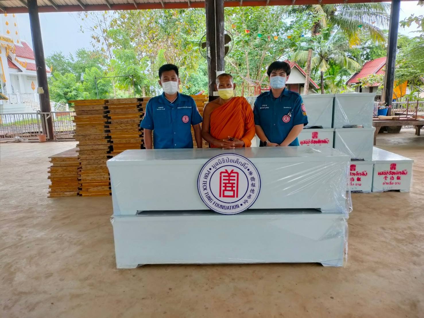 วัดหนองแวงศรัทธาธรรม อ.คูเมือง จ.บุรีรัมย์ วัดใหม่สำราญรมย์ อ.นาตาล จ.อุบลราชธานี วัดป่าพรหมนิมิต อ.วังหิน วัดบ้านคอกเลข อ.ไพรบึง จ.ศรีสะเกษ และวัดปากน้ำชุมพร อ.เมือง จ.ชุมพร รวมจำนวนโลงศพทั้งสิ้น 920 ใบ โดยวัดปากน้ำชุมพร มูลนิธิฯ ได้มอบผ้าดิบ จำนวน 500 ผืน หมวกกุยเล้ย จำนวน 100 ใบ และหมวกสามสี จำนวน 100 ใบ รวมงบประมาณทั้งสิ้น 755,000 บาท เพื่อช่วยเหลือญาติผู้เสียชีวิตที่ยากไร้ และผู้เสียชีวิตที่ไร้ญาติ สำหรับวัดสำนักสงฆ์ และหน่วยงานสาธารณกุศลที่ขาดแคลนโลงศพเพื่อช่วยเหลือประชาชนผู้ยากไร้ สามารถติดต่อสอบถามได้ที่มูลนิธิป่อเต็กตึ๊ง โทร 0-2225-0020 ต่อ ฝ่ายสังคมสงเคราะห์ ในวัน – เวลาราชการ