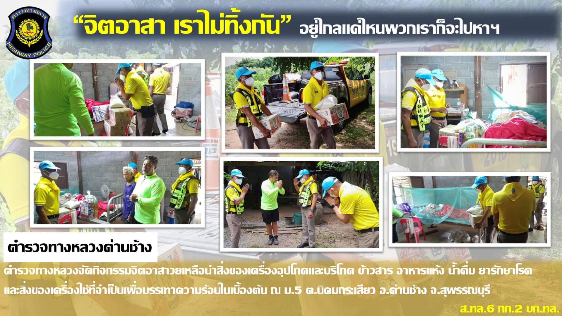 -ทล.จิตอาสา...ตำรวจทางหลวงกาญจนบุรีและสุพรรณบุรี ระหว่างออกตรวจพื้นที่รับผิดชอบพบปะประชาชน พูดคุยถึงสภาพพื้นที่ในชุมชน ม.5 ต.นิคมกระเสียว อ.ด่านช้าง จ.สุพรรณบุรี และได้รับข้อมูลว่า ในชุมชนมีผู้ป่วยติดเตียง 1 คน มีความขาดแคลนสิ่งของเครื่องอุปโภค-บริโภค ต่อมา พ.ต.ท.อิทธิศักดิ์ ค้ำคูณ สว.ส.ทล.6 กก.2 บก.ทล. ทราบเรื่องจึงสั่งการให้รีบดำเนินการช่วยเหลือนำสิ่งของเครื่องอุปโภค-บริโภค ข้าวสาร อาหารแห้ง น้ำดื่ม ยารักษาโรค และเครื่องใช้จำเป็นเพื่อบรรเทาความร้อนเบื้องต้นมามอบให้ผู้ป่วยติดเตียงทันที พร้อมกล่าวให้กำลังใจกับคนที่ดูแลผู้ป่วย “สู้ๆนะครับพวกเราจะกลับมาเยี่ยมกันอีกครับ"