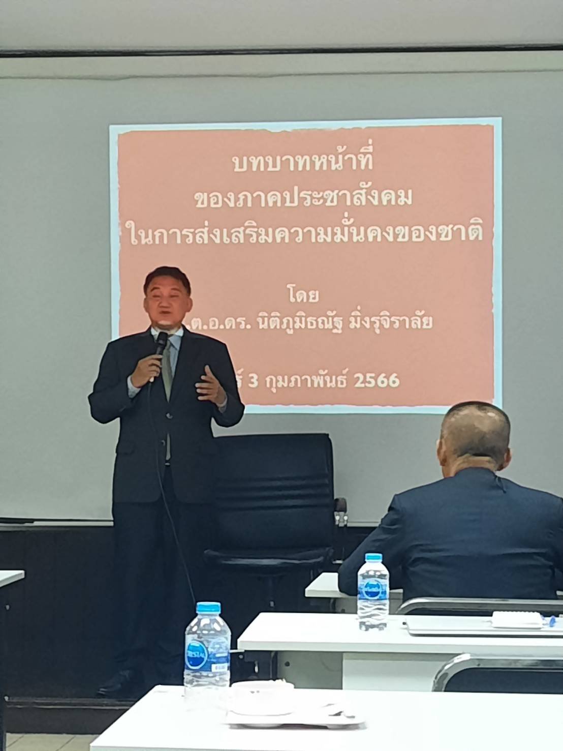 ขณะในช่วงบ่าย ร.ต.อ. ดร.นิติภูมิธนัฐ มิ่งรุจิราลัย อดีตสมาชิก สนช.และอดีตส.ส. มาบรรยายให้ความรู้ เรื่องบทบาทหน้าที่ของภาคประชาสังคม ในการส่งเสริมความมั่นคงของชาติ นอกจากนี้ยังได้ถ่ายทอดความรู้ประสบการณ์ที่มีโอกาสเดินทางไปเกือบทั่วทุกมุมโลก มาฉายภาพให้เห็นข้อมูลสำคัญๆหลายเรื่องที่น่าสนใจของแต่ละประเทศ รวมไปถึงความสำคัญของ“การข่าว”ในยุคปัจจุบันก็สามารถนำข้อมูลข่าวสารที่ได้รับรู้มาปรับใช้กับภาคธุรกิจได้เป็นอย่างดี