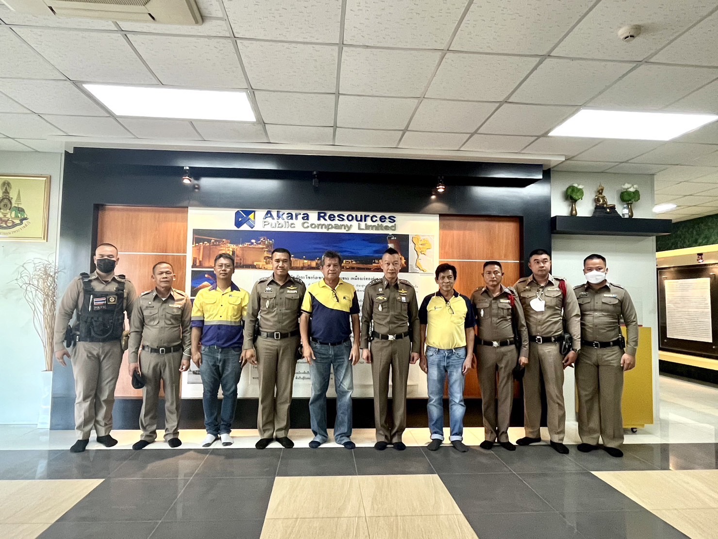 บ่ายวันเดียวกัน พ.ต.อ.ธราดล ,พ.ต.ท.อิสระ ร.ต.อ.วราวิชญ์ พงษ์เจริญ รอง สว.สส.พร้อมเจ้าหน้าที่สายตรวจตำบลเขาเจ็ดลูก ลงพื้นที่ตรวจเยี่ยมเหมืองทองอัครา รีซอร์สเซส โดยมีนายจำรัส แสงศรีจันทร์ ผู้จัดการทั่วไปฝ่ายสำรวจพร้อมคณะให้การต้อนรับ และบรรยายให้ความรู้เกี่ยวกับประวัติความเป็นมาของเหมืองทองฯ ก่อนพาสำรวจพื้นที่บริเวณภายในเหมืองแร่ทองคำฯ ตั้งอยู่ในพื้นที่ ต.เขาเจ็ดลูก อ.ทับคล้อ จ.พิจิตร.