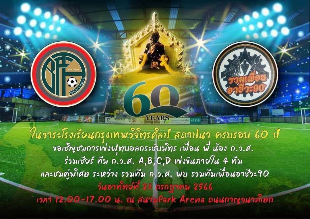 เมื่อวันก่อน (23 ก.ค.)ที่สนามฟุตบอลพาร์คอารีนา (Park Arena) ถ.กาญจนาภิเษก เขตตลิ่งชัน ธราธิป ผันใจผ่อง (ก.ว.ศ.รุ่น30) นำทีมฟุตบอล ชมรมศิษย์เก่าโรงเรียนกรุงเทพวิจิตรศิลป์ จัดกิจกรรมแข่งขันฟุตบอลนัดพิเศษ ในวาระฉลองครบรอบ 60 ปี เพื่อเชื่อมสายสัมพันธ์ และสร้างความรักความสามัคคี ระหว่างเพื่อนพี่น้องภายในกลุ่มศิษย์เก่า ก.ว.ศ. และทีมชมรมศิษย์เก่าอาชีวะต่างสถาบัน (เพื่อนอาชีวะยุค90) ให้ได้มาร่วมออกกำลังกายเตะฟุตบอลกระชับมิตร เพื่อเป็นแบบอย่างที่ดีให้กับน้อง ๆ นักศึกษาอาชีวะรุ่นใหม่ให้มีความสมัครสมานสามัคคียุติความรุนแรง โดยบรรยากาศภายในงานเป็นไปด้วยความสนุกสนาน และมิตรภาพในมวลหมู่พี่น้องผองเพื่อนศิษย์เก่าอาชีวะยุค 90.