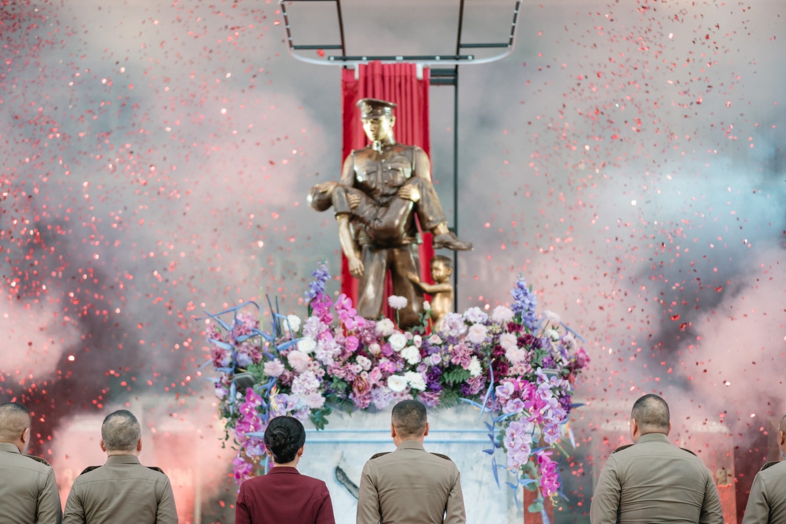 พล.ต.ต.พงพิพัฒน์ กล่าวว่าเมื่อปี พ.ศ. 2496 พล.ต.อ.เผ่า ศรียานนท์ อธิบดีกรมตำรวจ ได้จัดสร้างอาคารกรมตำรวจ ซึ่งก็คืออาคารสำนักงานตำรวจแห่งชาติ เขตปทุมวัน กรุงเทพมหานคร ในปัจจุบัน ซึ่งด้านหน้าอาคารได้จัดสร้าง ประติมากรรมอนุสาวรีย์ตำรวจผู้พิทักษ์รับใช้ประชาชน เมื่อก่อสร้างแล้วเสร็จพร้อมกัน ได้ทำพิธีเปิดในวันตำรวจเมื่อวันที่ 13 ตุลาคม 2496 ตั้งแต่นั้นมา อนุสาวรีย์ผู้พิทักษ์รับใช้ประชาชน จึงถือได้ว่าเป็นสัญลักษณ์ที่สำคัญของสำนักงานตำรวจแห่งชาติเป็นต้นมา ลักษณะของอนุสาวรีย์ตำรวจผู้พิทักษ์รับใช้ประชาชน เป็นรูปปั้นโลหะทองเหลืองรมมันปู องค์ประกอบรูปปั้นมี 3 ส่วน ส่วนที่ 1 รูปปั้นหุ่นตำรวจ (ชาย) มีขนาดเท่าคนจริงยืนอุ้มคนเจ็บ (ชาย) ส่วนที่ 2 รูปปั้นหุ่นประชาชนกำลังได้รับอันตราย และส่วนที่ 3 รูปปั้นเด็ก (ชาย) ยืนเกาะที่บริเวณขาช้าย แต่ละส่วนมีความหมายดังนี้