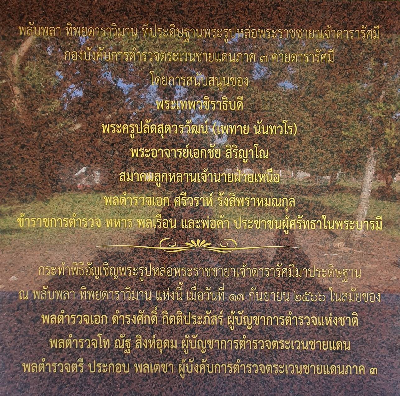 วันที่ 16 ก.ย.พล.ต.ต.ประกอบ พลเตชา ผู้บังคับการตำรวจตระเวนชายแดนภาค 3 เปิดเผยว่า วันพรุ่งนี้ (17 ก.ย.)เวลา 10.00 น.กองบังคับการตำรวจตระเวนชายแดนภาค 3 (ค่ายดารารัศมี) อ.แม่แตง จ.เชียงใหม่ จะมีพิธีอันเชิญพระรูปหล่อพระราชชายาเจ้าดารารัศมี จากวัดป่าดาราภิรมย์ อ.แม่ริม จ.เชียงใหม่มาประดิษฐานที่กองบังคับการตำรวจตระเวนชายแดนภาค 3 และพิธีฉลองพลับพลาทิพยดาราวิมาน-ถวายสักการะพระรูปหล่อพระราชชายาเจ้าดารารัศมี ที่กองบังคับการตำรวจตระเวนชายแดนภาค 3 โดยมี พล.ต.อ.ศรีวราห์ รังสิพราหมณกุล เดินทางเข้าร่วมเป็นประธานในพิธีฯ ทั้งนี้พิธีฯดังกล่าวถือเป็นประวัติศาสตร์หน้าใหม่ของ บก.ตชด.ภาค 3 อย่างไรก็ตามต้องขอกราบขอบพระคุณผู้มีจิตศรัทธาร่วมบุญ และผู้เข้าร่วมในพิธีฯในครั้งนี้เป็นอย่างสูง