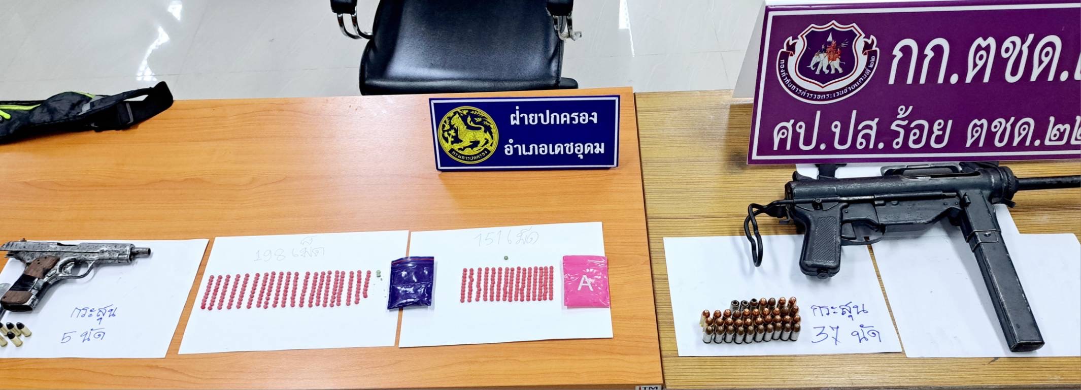 "ยุทธการ 90 วัน เดชอุดมพ้นภัยยาเสพติด" ฝ่ายปกครองฯ-กำนัน-ผู้ใหญ่บ้าน-ผู้ช่วยฯติดเครื่องลุยแหลกจับอาวุธสงครามปืนกลมือ ปืนไทยประดิษฐ์ พร้อมเครื่องกระสุน-ยาบ้าเพียบ