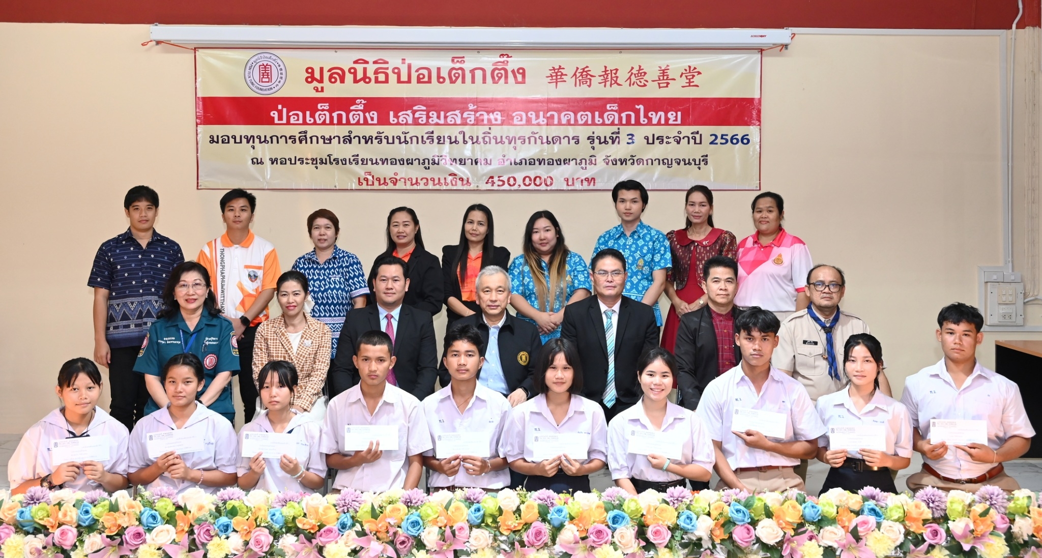 เมื่อวานนี้ ( 7 ธ.ค.) มูลนิธิป่อเต็กตึ๊ง นำโดย นายนิพนธ์ ลีละศิธร กรรมการมูลนิธิฯ พร้อมด้วย นางสาวดวงชุตา ติยะพจนพรกุล ผู้ช่วยผู้จัดการฝ่ายสังคมสงเคราะห์ นำทีมแผนกส่งเสริมการศึกษาและอาชีพลงพื้นที่ จ.กาญจนบุรี มอบทุนการศึกษาระดับมัธยมศึกษาสำหรับเยาวชนโรงเรียนตำรวจตระเวนชายแดน รุ่นที่ 3 (ครั้งที่ 1) ประจำปี 2566 ประกอบด้วย โรงเรียนราชประชานุเคราะห์ 45 อ.พนมทวน โรงเรียนร่มเกล้ากาญจนบุรี (ในพระราชดำริ) โรงเรียนทองผาภูมิวิทยาคม โรงเรียนสมาคมป่าไม้แห่งประเทศไทยอุทิศ โรงเรียนบ้านเกริงกระเวีย โรงเรียนบ้านห้วยเสือ อ.ทองผาภูมิ และโรงเรียนอุดมสิทธิศึกษา อ.สังขละบุรี รวม 7 แห่ง จำนวน 60 ทุน รวมงบประมาณทั้งสิ้น 450,000 บาท นอกจากนี้มูลนิธิฯยังได้มอบผ้าห่มกันหนาวพร้อมขนมให้กับนักเรียนที่เข้ารับมอบทุนฯ โดยจัดพิธีมอบทุนการศึกษา ที่หอประชุม โรงเรียนทองผาภูมิวิทยาคม อ.ทองผาภูมิ จ.กาญจนบุรี