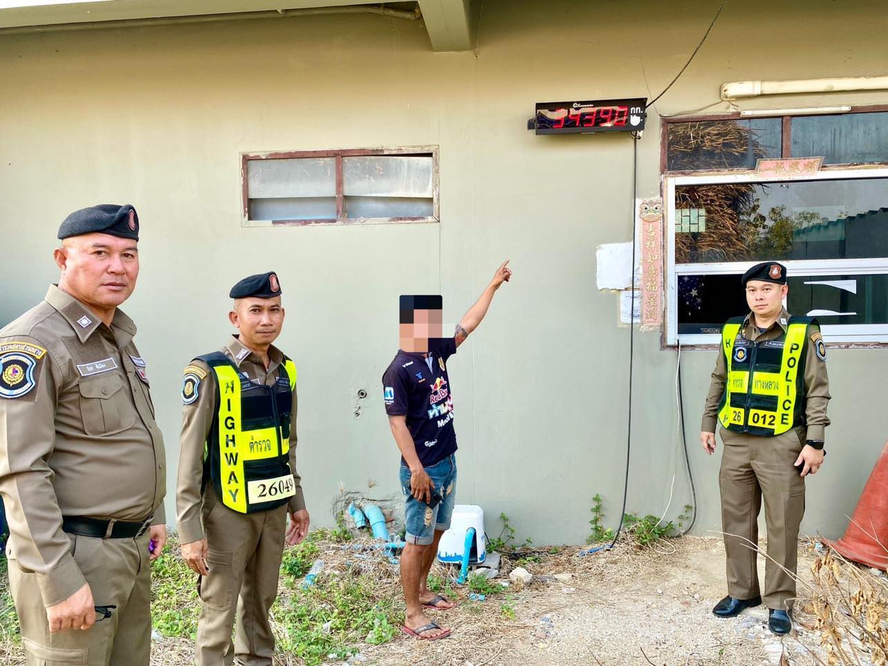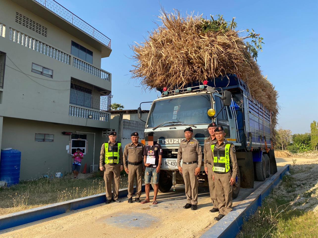ร่วมกันจับกุมตัวนายเอ (นามสมมุติ) อายุ 28 ปี โดยกล่าวหาว่า 1.ใช้ยานพาหนะน้ำหนักลงเพลาเกินกว่าอัตราที่กฎหมายกำหนด” (พ.ร.บ.ทางหลวง ม.61 , ม.73/2 และประกาศของผู้อำนวยการทางหลวงแผ่นดิน) ทะเบียน 82-4308 กาญจนบุรี น้ำหนักรวม 34,390 กก. ซึ่งเกินกว่าที่กฎหมายกำหนดไว้ว่ารถบรรทุก ชนิด 3 เพลา 6 ล้อ ยาง 10 เส้น ต้องมีน้ำหนักไม่เกิน 25,000 กิโลกรัม ซึ่งคันที่ผู้ต้องหาขับมีน้ำหนักเกินมา 9,390 กิโลกรัม