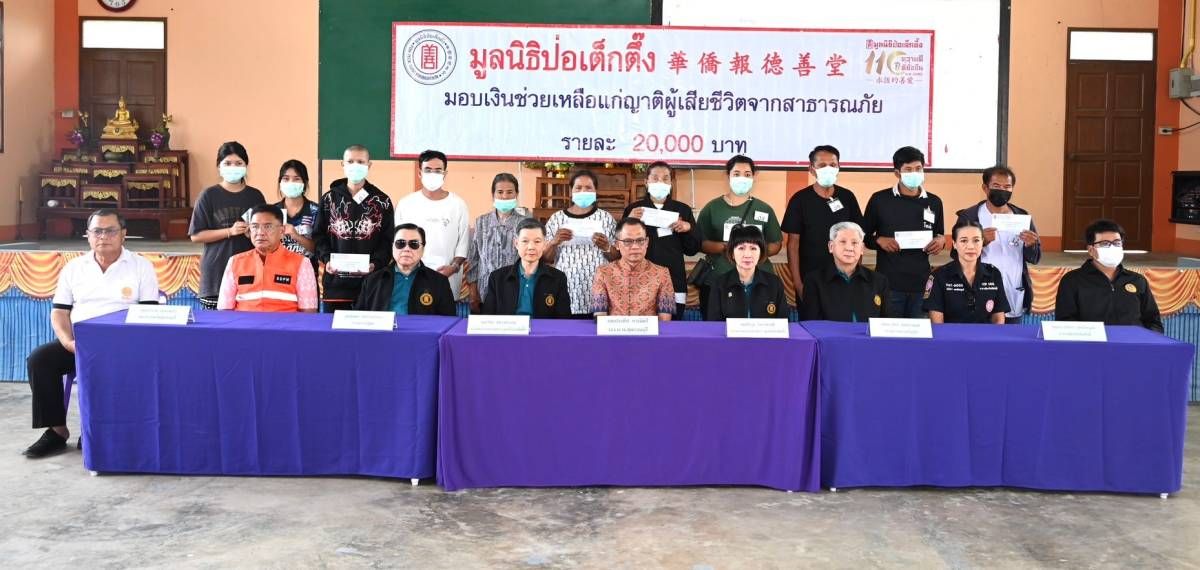 โดยวันนี้ (24 ม.ค.) มูลนิธิป่อเต็กตึ๊ง นำโดยนายวิชิต ชินวงศ์วรกุล รองประธานกรรมการ พร้อมด้วย นางศิริกุล โอภาสวงศ์ กรรมการและเลขาธิการ นายจารุรัตน์ คุณัตถานนท์ กรรมการและเหรัญญิก และนายนิพนธ์ โชคภิรมย์วงศา กรรมการปฏิคม นำทีมแผนกสาธารณภัย ฝ่ายสังคมสงเคราะห์ นำโดยนางศิริพร กระจ่างหล้า ผู้จัดการฝ่ายสังคมสงเคราะห์ ลงพื้นที่องค์การบริหารส่วนตำบลศาลาขาว เพื่อเข้าพบพร้อมให้กำลังใจและมอบเงินช่วยเหลือค่าฌาปนกิจแก่ครอบครัวผู้เสียชีวิตจากเหตุการณ์ดังกล่าว รวม 23 รายๆ ละ 20,000 บาท รวมงบประมาณทั้งสิ้น 460,000 บาท โดยมีนายประทีป การมิตรี รองผู้ว่าราชการจังหวัดสุพรรณบุรี พร้อมด้วย อาสาสมัครมูลนิธิป่อเต็กตึ๊ง นำโดย ดร.ปภัสรา เตชะไพบูลย์ อาสาสมัครกิตติมศักดิ์ ร่วมในพิธีที่องค์การบริหารส่วนตำบลศาลาขาว อ.เมืองสุพรรณบุรี มูลนิธิป่อเต็กตึ๊ง ขอแสดงความเสียใจ และขอส่งกำลังใจไปยังครอบครัวผู้เสียชีวิต ผู้ได้รับบาดเจ็บ และผู้ได้รับผลกระทบจากเหตุการณ์ดังกล่าวทุกท่านมา ณ ที่นี้