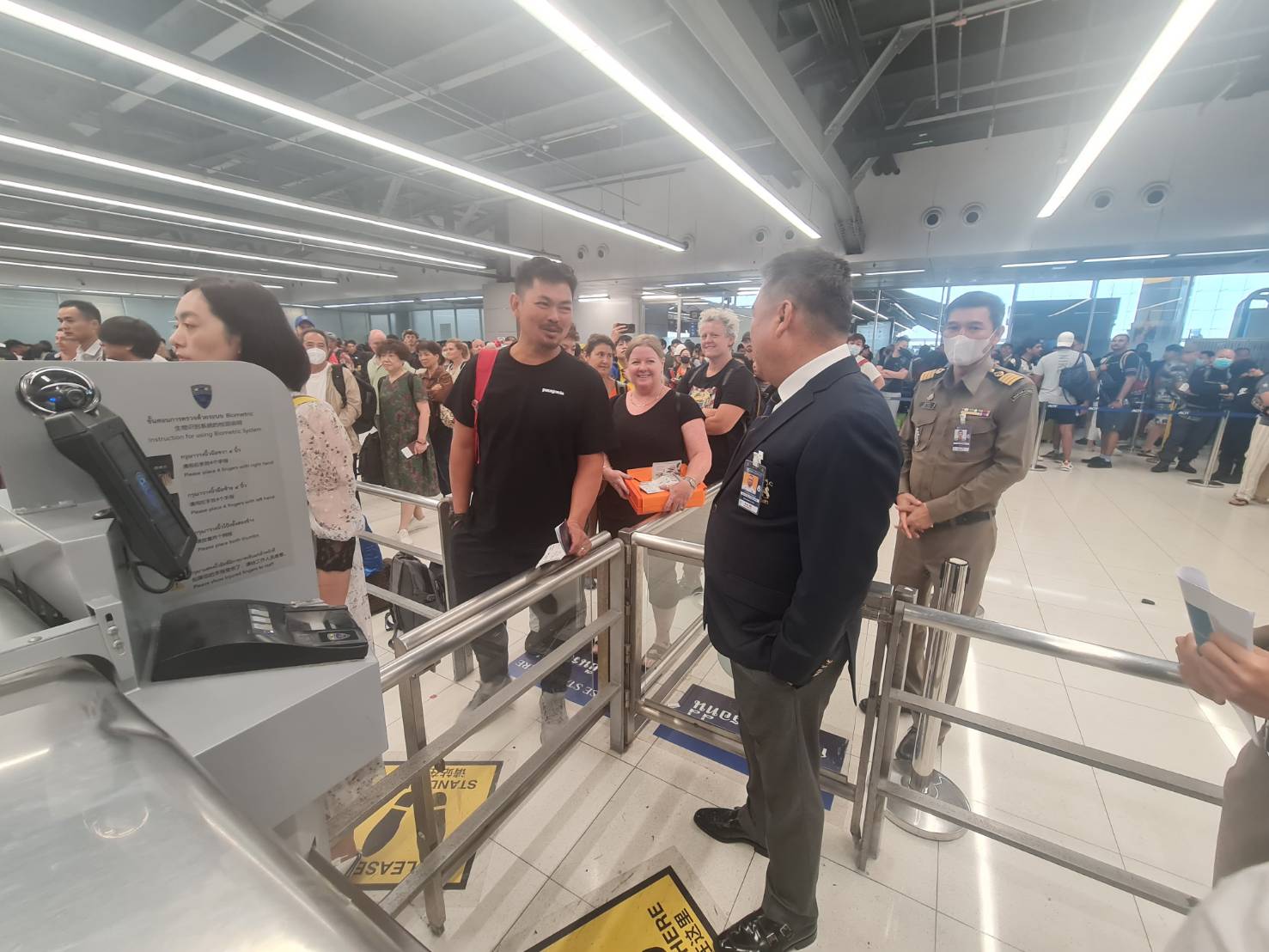 โดยเฉพาะผู้โดยสารขาออกระหว่างประเทศที่ท่าอากาศยานสุวรรณภูมิเกิดการสะสมอย่างรวดเร็ว แถวยาวล้นมาถึงจุดตรวจค้นสัมภาระอย่างรุนแรง โดยทางศูนย์เทคโนโลยีตรวจคนเข้าเมืองซึ่งควบคุมระบบเทคโนโลยีดังกล่าวให้เร่งแก้ไขโดยด่วน ขณะเดียวกัน ทาง ผบก.ตม.2 ได้สั่งการให้ ตม.ท่าอากาศยานสุวรรณภูมิ ซึ่งได้รับผลกระทบมากที่สุดแก้ปัญหาตามแผนเผชิญเหตุกรณีระบบล่มตามรหัส Com Down โดยใช้กำลังเจ้าหน้าที่ตรวจสอบด้วยระบบ Manual และ ใช้ระบบ APPS ของท่าอากาศยานสุวรรณภูมิ คัดกรองบุคคลที่อาจมีหมายจับ และ overstay เพื่อเร่งระบายผู้โดยสารโดยเร็วที่สุด เพื่อไม่ให้กระทบต่อการขึ้นเครื่อง ทำให้ความหนาแน่นเริ่มคลี่คลาย แต่ยังสะสมต่อเนื่อง