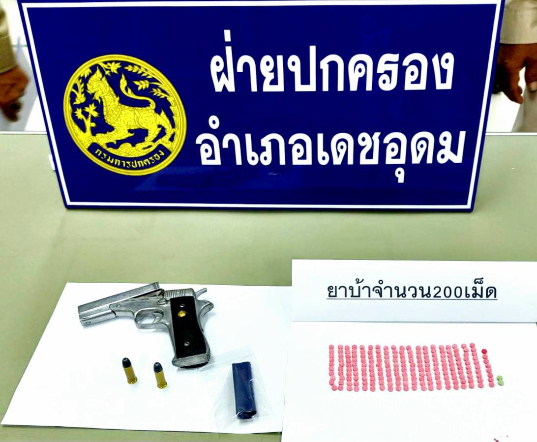 ชุดปฏิบัติการพิเศษฝ่ายปกครองอำเภอเดชอุดม รวบ " เอ โนนสมบูรณ์ " คา อบต.พร้อมของกลางปืน .38 และเครื่องกระสุน พร้อมขยายผลตรวจยึดยาบ้า 200 เม็ด