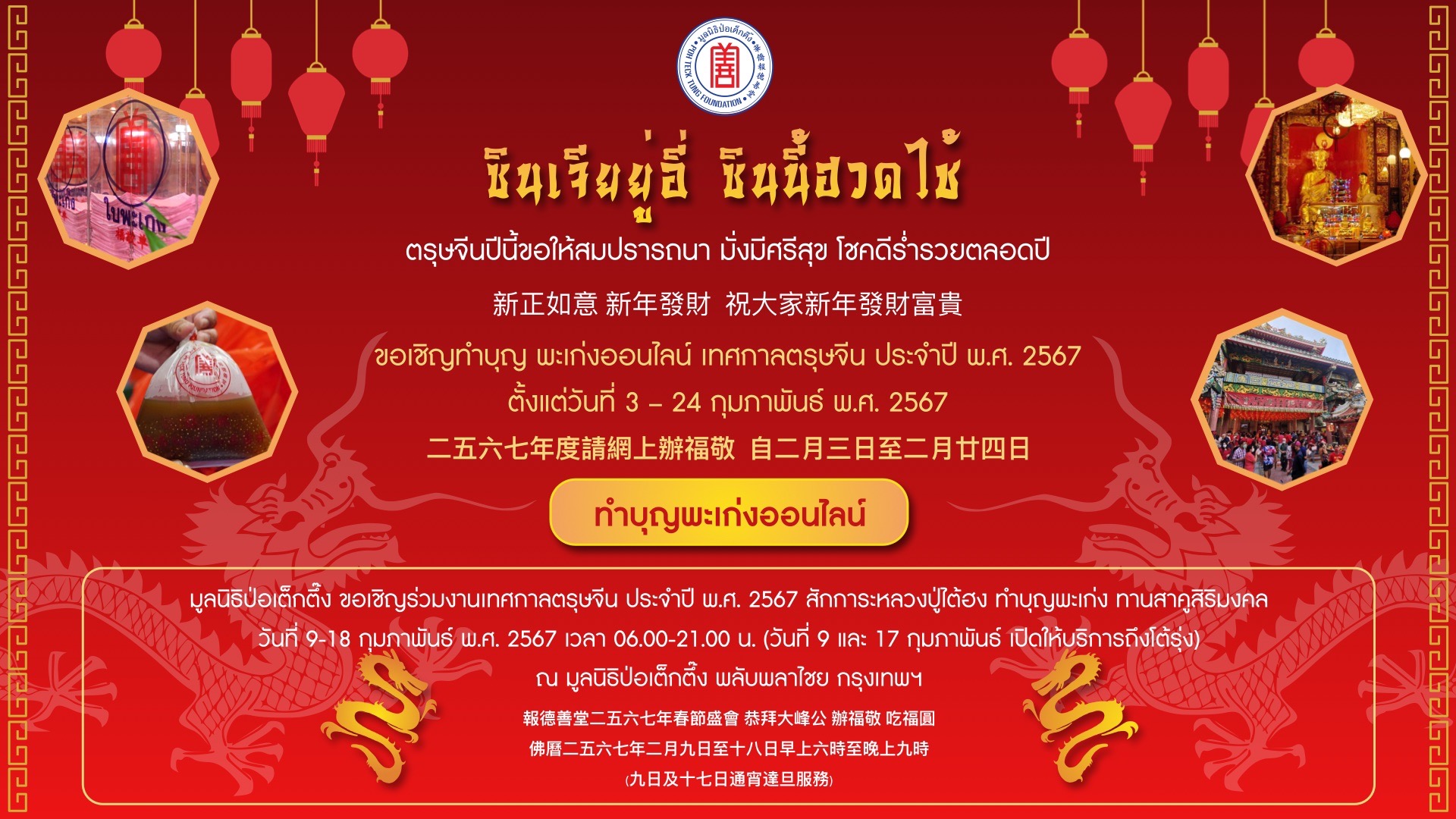 ระหว่างวันที่ 9 – 18 ก.พ.มูลนิธิป่อเต็กตึ๊ง โดยนายวิเชียร เตชะไพบูลย์ ประธานกรรมการมูลนิธิฯ ขอเชิญทุกท่านร่วม“สักการะหลวงปู่ไต้ฮง”ขอพรเนื่องในเทศกาลตรุษจีนเพื่อความเป็นสิริมงคลต้อนรับปีใหม่ ลงชื่อ สวดชัยมงคลคาถา หรือ“พะเก่ง”เพื่อสะเดาะเคราะห์ ขอให้ครอบครัวมีสุข เสริมโชคลาภ เสริมดวงชะตา เสริมความมั่นคงสถาพร ตลอดปี รวมถึงทำบุญสะเดาะเคราะห์และเสริมความเป็นสิริมงคลกับรูปปั้นนักษัตรปีมะโรง ซึ่งได้ผ่านการทำพิธีเบิกเนตรโดยพระอาจารย์จีนคณาณัติจีนพรต (เย็นงี้) เจ้าอาวาสวัดมังกรกมลาวาส (วัดเล่งเน่ยยี่) พร้อม รับประทาน “สาคูสิริมงคล” เพื่อความกลมเกลียวและอยู่เย็นเป็นสุข