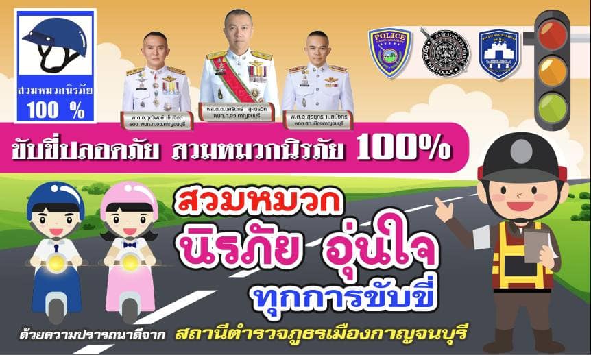 โดยมีการแนะนำและให้ความรู้ประชาชน และนักเรียนเกี่ยวกับการขับขี่รถจักรยานยนต์ต้องสวมหมวกนิรภัยทุกครั้งเพื่อลดการบาดเจ็บ และการเสียชีวิตจากการเกิดอุบัติเหตุ มีการมอบหมวกนิรภัยให้กับประชาชนที่ไม่มี และไม่ได้สวมหมวกนิรภัยเพื่อความปลอดภัยในการใช้รถใช้ถนนร่วมกัน จึงจัดกิจกรรมและการประชาสัมพันธ์ที่ริมถนนแสงชูโต หน้าร้านพูนสินการไฟฟ้า ต.บ้านเหนือ อ.เมือง จ.กาญจนบุรี ด้วยความปรารถนาดีจากสถานีตำรวจภูธรจังหวัดกาญจนบุรี.