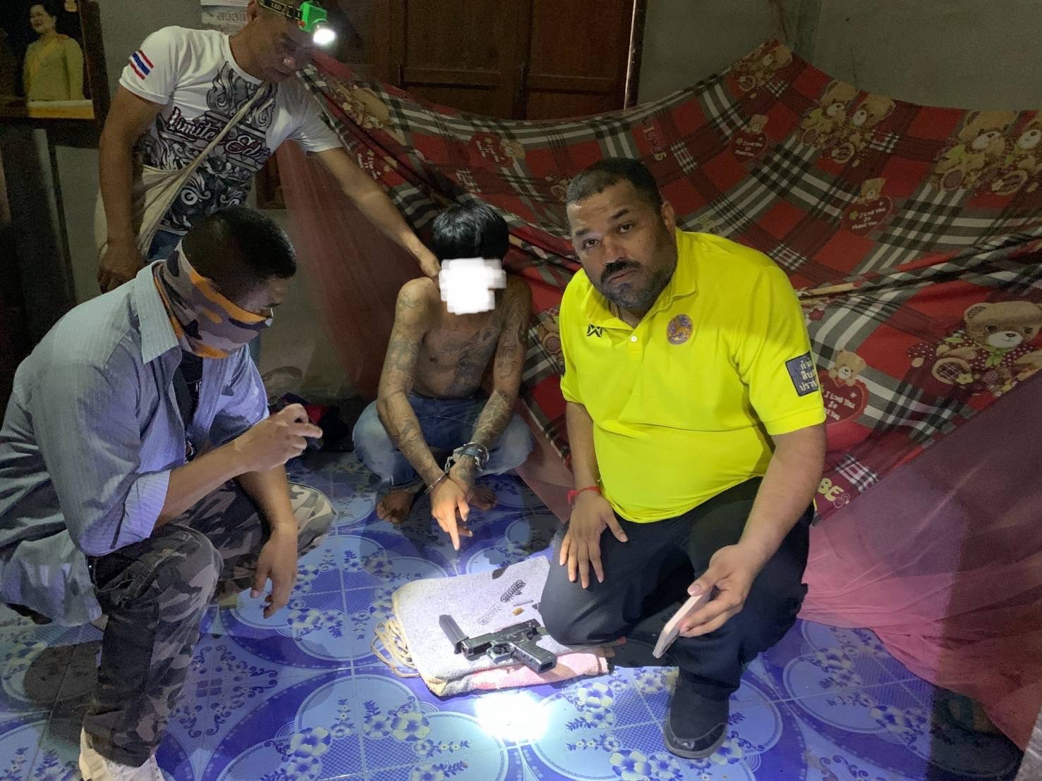 เมื่อเจ้าหน้าที่เดินทางไปถึงบ้านดังกล่าวพบนายเอ และนายบี (นามสมมุติ) จากการตรวจค้นพบของกลางปืนยาวไทยประดิษฐ์จ 1 กระบอกชุกไว้ภายในตู้เสื้อผ้า ปืนสั้น 2 กระบอกอยู่ในห้องนอน ยาบ้าอีก 12 เม็ด สอบสวนทั้งสองให้การรับสารภาพ ทั้งนี้ชุดปฏิบัติการพิเศษฝ่ายปกครองฯทำบันทึกจับกุม-นำตัวผู้ต้องหาพร้อมของกลางส่งพนักงานสอบสวนดำเนินคดีต่อไป.