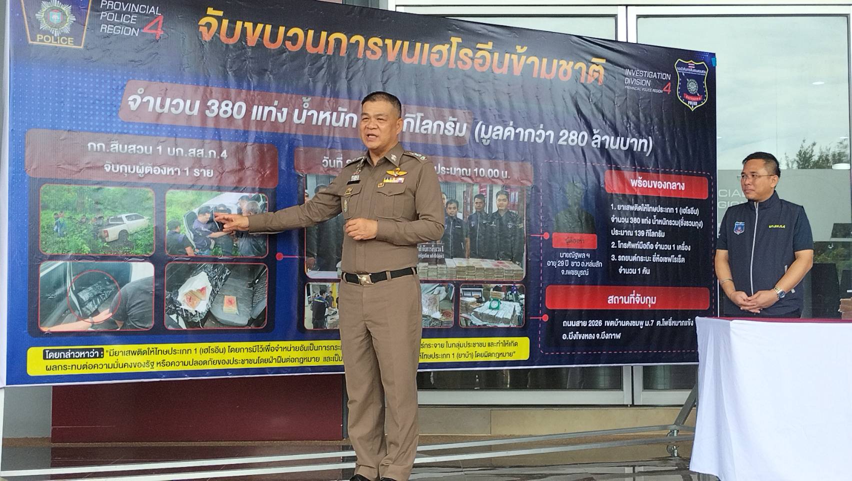 ตำรวจภูธรภาค 4 รวบตัวขบวนการขนยาเสพติด ได้ตัวผู้ต้องหาพร้อมของกลางเฮโรอีนข้ามชาติ 380 แท่ง น้ำหนัก 139 กิโลกรัม มูลค่ากว่า 280 ล้านบาท