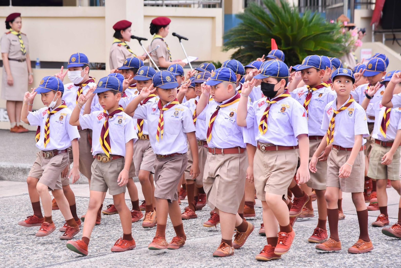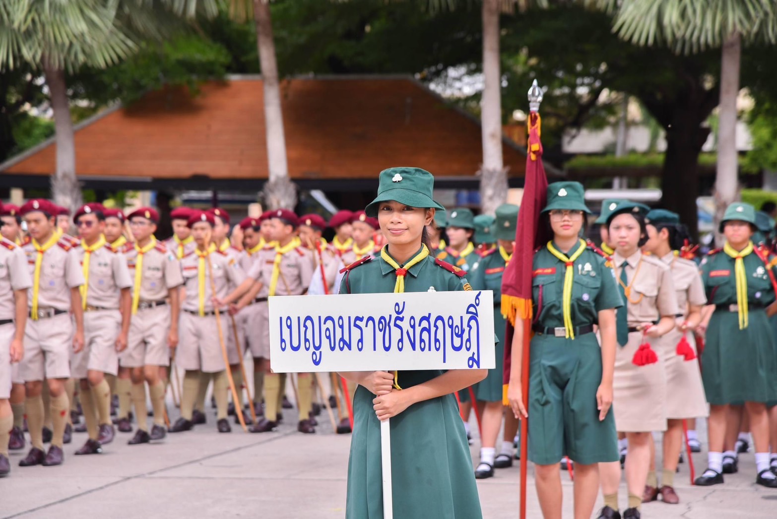 โดยในพิธีได้มีการเชิญธงลูกเสือจังหวัด เข้าสู่บริเวณพิธีจากนั้นผู้บังคับบัญชาลูกเสืออาวุโสนำลูกเสือกล่าวคำปฏิญาณตนก่อนเข้าสู่พิธีการสวนสนามและทบทวนคำปฏิญาณตน โดยมีมีลูกเสือ–เนตรนารีเข้าร่วมพิธีสวนสนาม และมีผู้บังคับบัญชาลูกเสือ-เนตรนารี