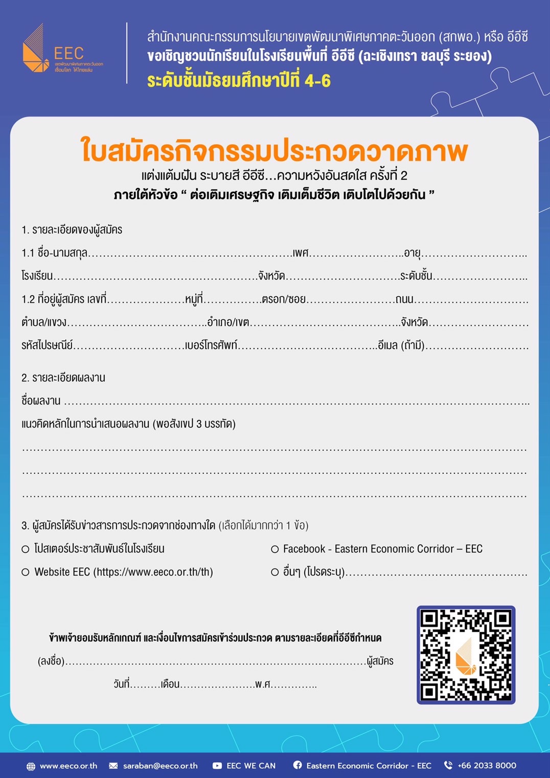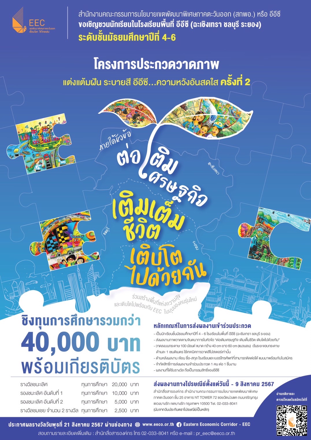 "อีอีซี"จัดประกวดวาดภาพ ปีที่ 2 ในหัวข้อ“ต่อเติมเศรษฐกิจ เติมเต็มชีวิต เติบโตไปด้วยกัน”ชิงทุนการศึกษารวมกว่า 40,000 บาท สนใจรีบสมัครด่วน