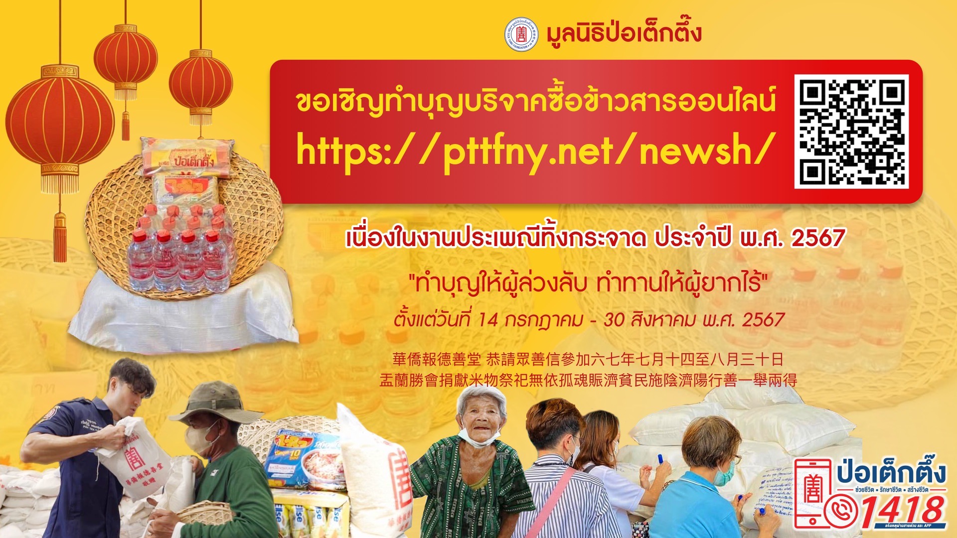นอกจากนี้สำหรับท่านที่ประสงค์ทำบุญทิ้งกระจาดออนไลน์ ผ่านเว็บไซต์ https://pttfny.net/newsh ในปี 2567 นี้ ท่านสามารถร่วมทำบุญผ่านระบบออนไลน์ ได้ตั้งแต่วันที่ 10 ก.ค.นี้ เป็นต้นไป สามารถติดต่อสอบถาม ติดตามข่าวสารกิจกรรม และการช่วยเหลือของมูลนิธิป่อเต็กตึ๊ง ได้ที่เฟซบุ๊ก แฟนเพจ www.facebook.com/atpohtecktung