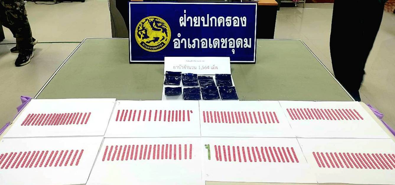 ชุดปฏิบัติการพิเศษฝ่ายปกครองอำเภอเดชอุดมสนธิกำลังตำรวจ-ตชด.บุกจับรอบ 2 เอเย่นต์ยานรกกลางทุ่งนา พร้อมของกลางยาบ้า 1,564 เม็ด เผยไม่เข็ดก่อนหน้าเคยโดนซิวมาแล้ว