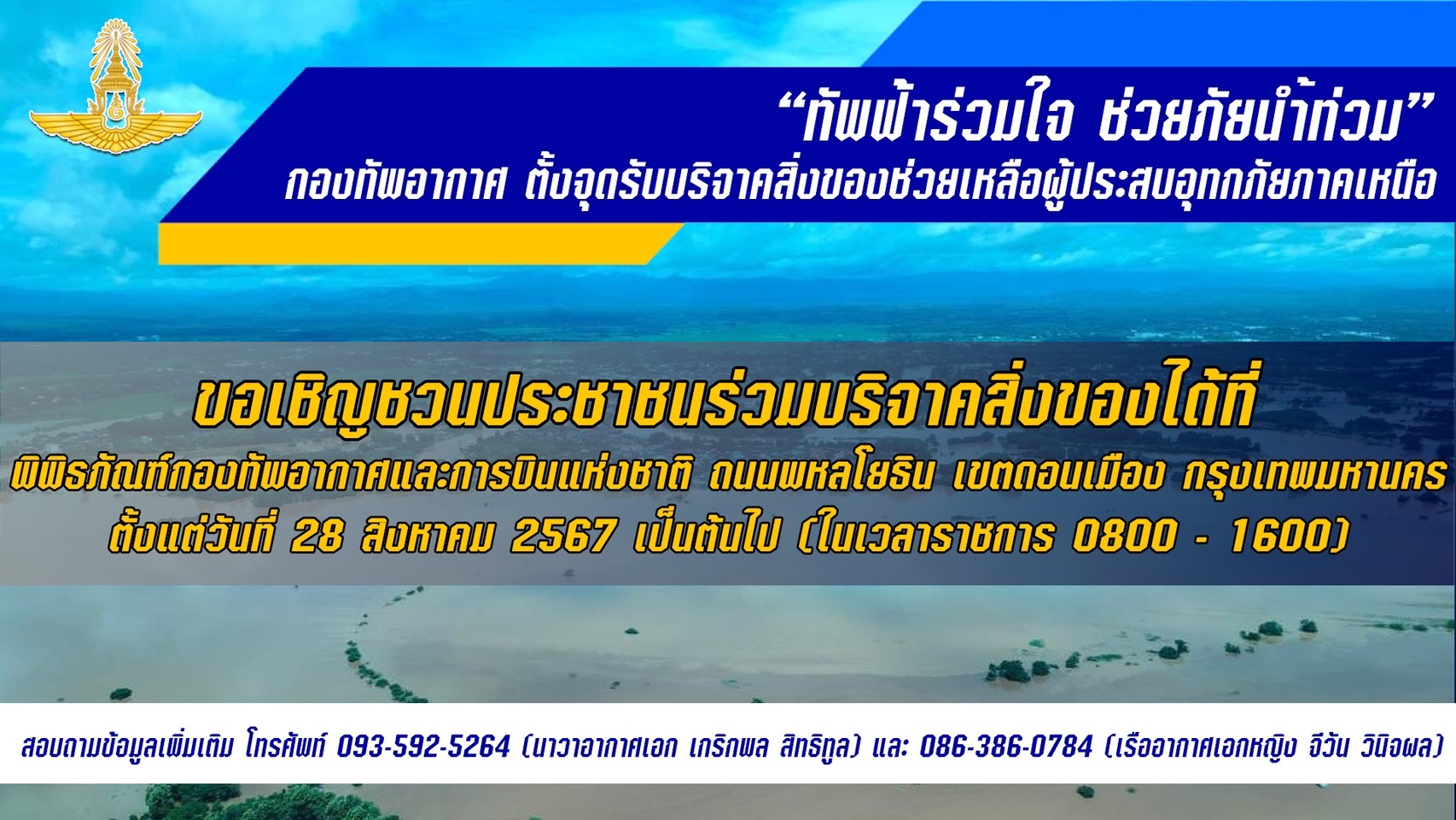 กองทัพอากาศจึงขอเชิญชวนประชาชนร่วมบริจาคสิ่งของช่วยเหลือผู้ประสบอุทกภัยภาคเหนือได้ที่พิพิธภัณฑ์กองทัพอากาศ และการบินแห่งชาติ ถ.พหลโยธิน แขวงสีกัน เขตดอนเมือง กรุงเทพมหานคร ตั้งแต่วันที่ 28 ส.ค.เป็นต้นไป (ในเวลาราชการ 0800 - 1600) ทั้งนี้สามารถติดต่อสอบถามข้อมูลเพิ่มเติมได้ที่ หมายเลขโทรศัพท์ 093 592 5264 (นาวาอากาศเอก เกริกพล สิทธิทูล) และ 086 386 0784 (เรืออากาศเอกหญิง จีวัน วินิจผล)