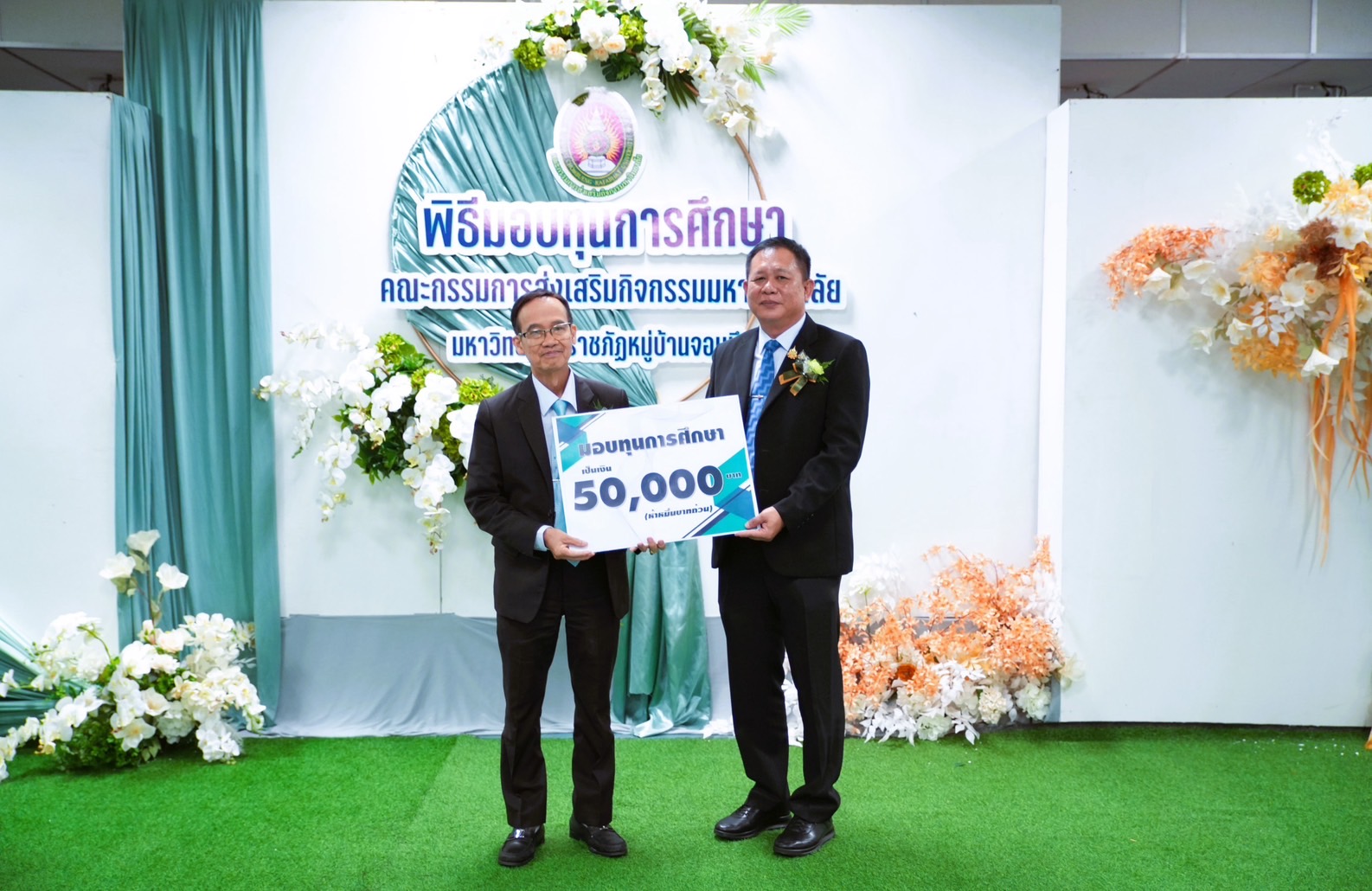 โดยมีคณะกรรมการส่งเสริมกิจการมหาวิทยาลัย นายพัฒนพงศ์ ชื่นชอบ นายอำเภอจอมบึง ผศ.อรรถพล อุสายพันธ์ รองอธิการบดีมหาวิทยาลัยราชภัฏหมู่บ้านจอมบึง และแขกผู้มีเกียรติร่วมมอบทุนการศึกษาให้กับนักศึกษาจำนวน 119 ทุน ๆ ละ 5,000 บาท รวมเป็นเงิน 595,000 บาท นอกจากนี้นายพัฒนพงศ์ยังได้ร่วมมอบทุนการศึกษาให้กับนักศึกษาจำนวน 10 ทุนด้วย โดย ผศ.ดร.ชัยฤทธิ์ ได้กล่าวขอบคุณคณะกรรมการส่งเสริมกิจการมหาวิทยาลัย ที่มีส่วนร่วมในการสนับสนุนทุนการศึกษาให้กับนักศึกษาของมหาวิทยาลัย และกล่าวให้โอวาทและกล่าวแสดงความยินดีกับนักศึกษาที่ได้รับทุนการศึกษาในครั้งนี้