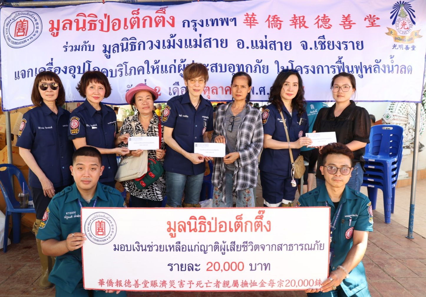 นอกจากนี้ยังได้มอบเงินสงเคราะห์ค่าฌาปนกิจให้แก่ญาติผู้เสียชีวิตจำนวน 18 ราย ๆ ละ 20,000 บาท รวมงบประมาณการช่วยเหลือทั้งสิ้น 4,410,000 บาท โดยมีผู้แทนจากหน่วยงานรัฐเป็นประธานในพิธี พร้อมด้วยทีมงานแผนกบรรเทาสาธารณภัย และแผนกอาสาสมัครมูลนิธิฯ รวมทั้งอาสาสมัครกิตติมศักดิ์มูลนิธิป่อเต็กตึ๊ง นำโดยนางศิริพร โอภาสวงศ์ และนางศิริวรรณ โอภาสวงศ์ และอาสาสมัครศิลปินมูลนิธิป่อเต็กตึ๊ง นำโดยนางสาวอัญชลี จงคดีกิจ (ปุ๊-อัญชลี) ร่วมลงพื้นที่แจกจ่ายและให้กำลังใจแก่ผู้ประสบภัย ในพื้นที่ รวมถึง มูลนิธิฯ/สมาคมจีนประจำจังหวัดต่างๆ เป็นผู้ประสานงานและร่วมในพิธี