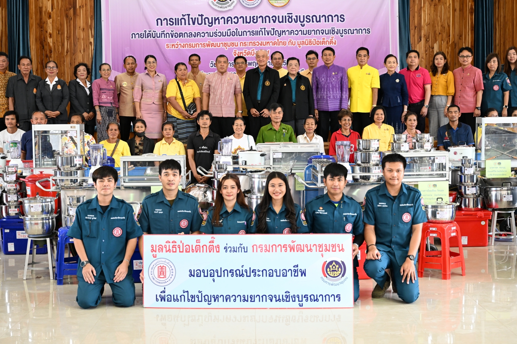 โครงการแก้ไขปัญหาความยากจนเชิงบูรณาการ มูลนิธิป่อเต็กตึ๊ง ได้สนับสนุนอุปกรณ์ประกอบอาชีพ ช่วยเหลือครัวเรือนยากจน ตามบันทึกข้อตกลงความร่วมมือแก้ไขปัญหาความยากจน ระหว่างกรมการพัฒนาชุมชนและมูลนิธิป่อเต็กตึ๊ง ซึ่งมูลนิธิฯ ได้จัดงบประมาณดำเนินการเพื่อจัดหาวัสดุอุปกรณ์การประกอบอาชีพมอบให้แก่ครัวเรือนยากจน ให้สามารถประกอบอาชีพเลี้ยงตนเองและครอบครัว โดยในกลุ่มเป้าหมายแรกดำเนินการในพื้นที่ภาคกลาง 17 จังหวัด รวม 98 ครัวเรือน