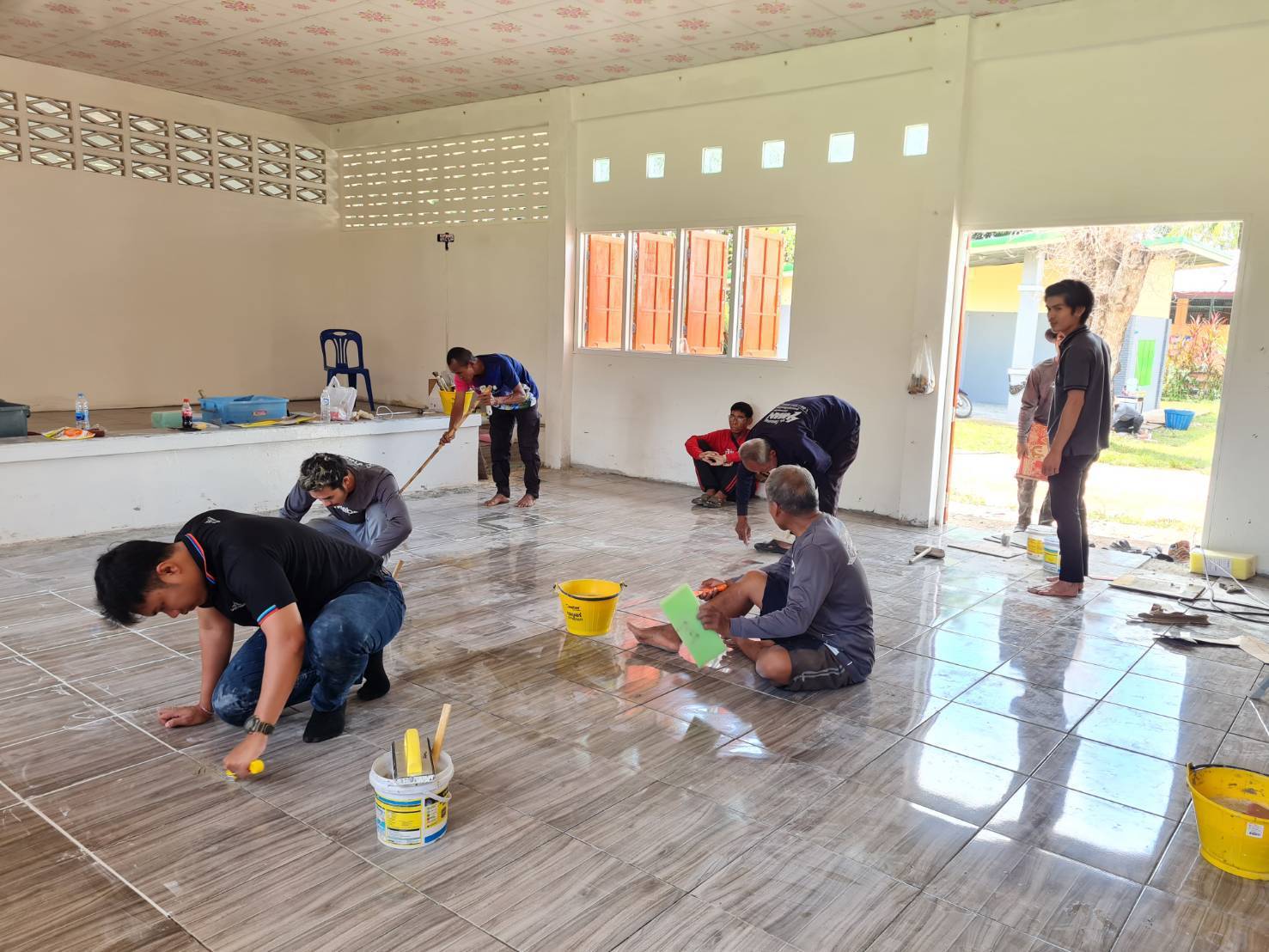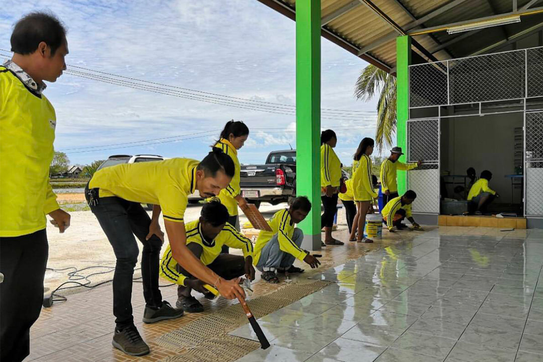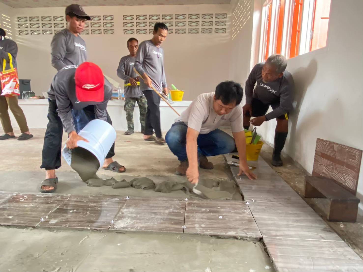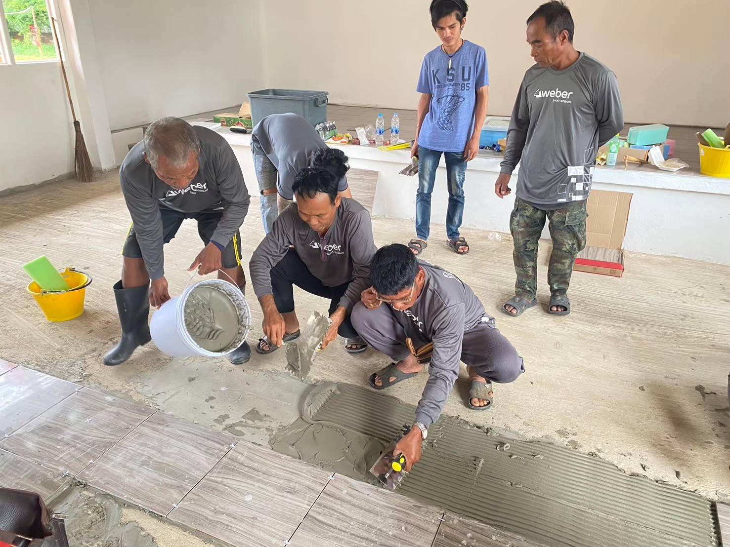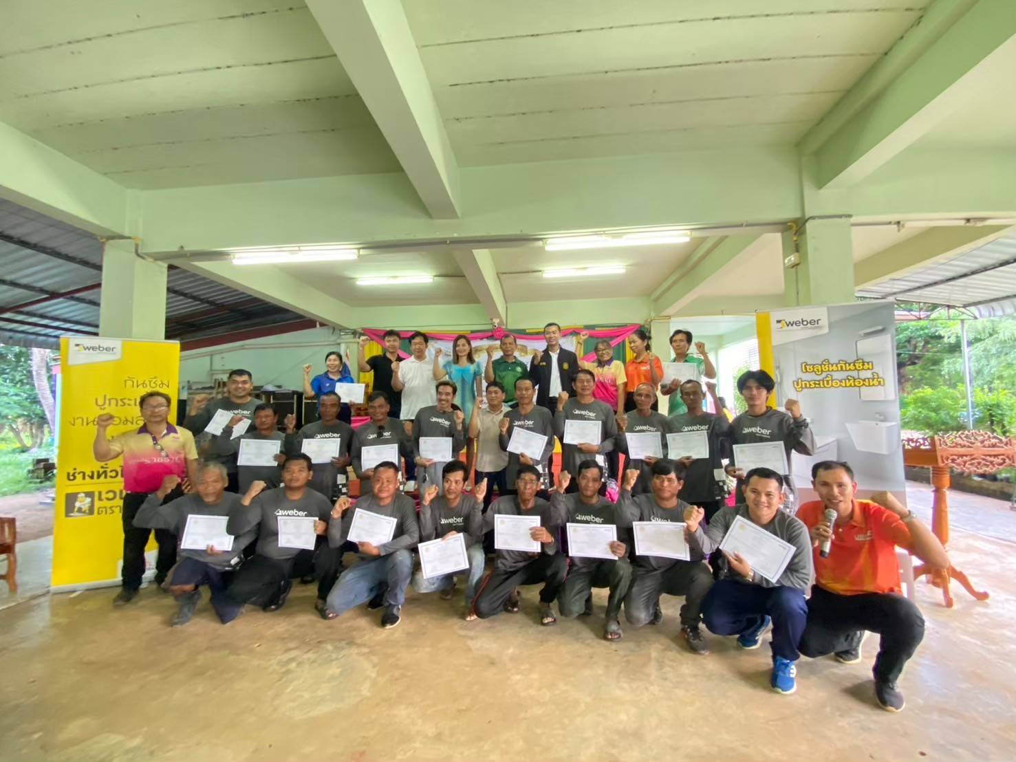 ทั้งนี้ได้ใช้สถานที่ของวัด หรือโรงเรียน หรือโรงพยาบาลที่ต้องการปูกระเบื้องและก่ออิฐมวลเบา (พื้นที่ปูกระเบื้องไม่เกิน 50 ตารางเมตร) เพื่อเป็นการสร้างประสบการณ์จริงในการทำงานของผู้เข้ารับการฝึก และสร้างประโยชน์ให้แก่ชุมชนอีกด้วย โดยบริษัท แซง-โกแบ็ง เวเบอร์ จำกัดสนับสนุนวิทยากร วัสดุฝึกอบรม ในกลุ่มผลิตภัณฑ์กระเบื้องไม่เกิน 50 ตารางเมตร ปูนกาว และยาแนว ปูนก่ออิฐมวลเบา และอิฐมวลเบา นอกจากนี้ยังให้การสนับสนุนงบประมาณเป็นค่าอาหารกลางวัน ค่าอาหารว่าง และเครื่องดื่ม และเอกสารประกอบการฝึกอบรมอีกด้วย