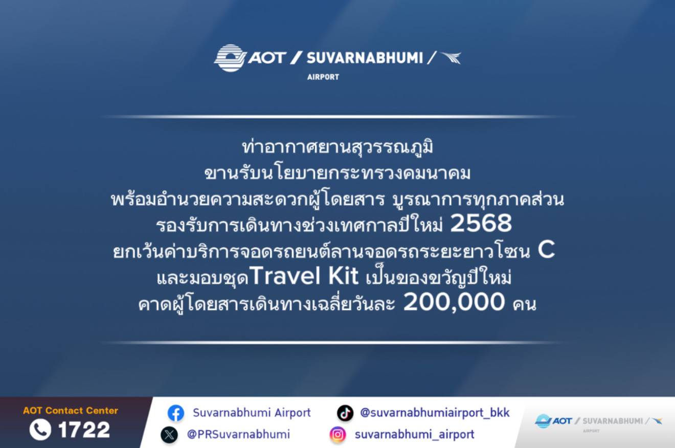 ท่าอากาศยานสุวรรณภูมิขานรับนโยบายกระทรวงคมนาคมพร้อมอำนวยความสะดวกผู้โดยสารบูรณาการทุกภาคส่วนรองรับการเดินทางช่วงเทศกาลปีใหม่ 2568 ยกเว้นค่าบริการจอดรถยนต์ลานจอดรถระยะยาวโซน C และมอบชุด Travel Kit เป็นของขวัญปีใหม่ คาดผู้โดยสารเดินทางเฉลี่ยวันละ 200,000 คน