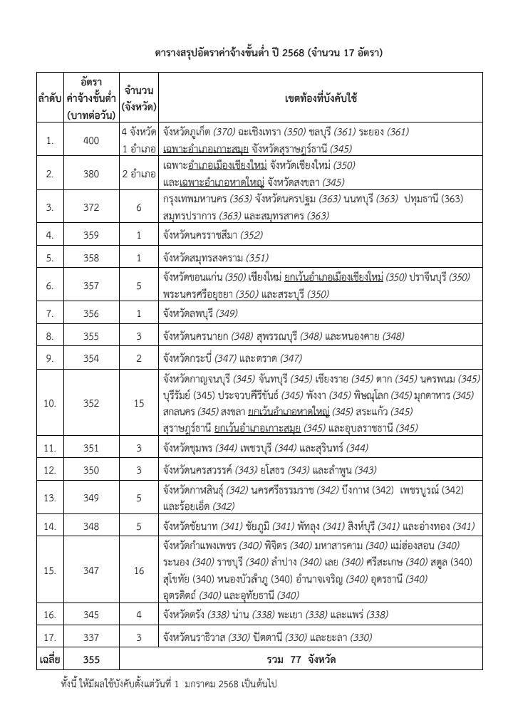 2.กำหนดอัตราค่าจ้างขั้นต่ำเป็นวันละ 380 บาท ในอำเภอเมืองเชียงใหม่ จ.เชียงใหม่ และอำเภอหาดใหญ่ จ.สงขลา 3.กำหนดอัตราค่าจ้างขั้นต่ำเป็นอัตราวันละ 372 บาท ในเขตท้องที่กรุงเทพฯ และปริมณฑล รวม 6 จังหวัด (เพิ่มขึ้นร้อยละ 2.5) และ 4. กำหนดอัตราค่าจ้างขั้นต่ำ 67 จังหวัดที่เหลือให้ปรับค่าจ้างขั้นต่ำเพิ่มขึ้นร้อยละ 2.0 โดยให้มีผลใช้บังคับตั้งแต่วันที่ 1 มกราคม 2568 เป็นต้นไป ทั้งนี้กระทรวงแรงงานจะได้นำเรื่องนี้เสนอคณะรัฐมนตรีเพื่อประกาศในราชกิจจานุเบกษาให้มีผลบังคับใช้ต่อไป
