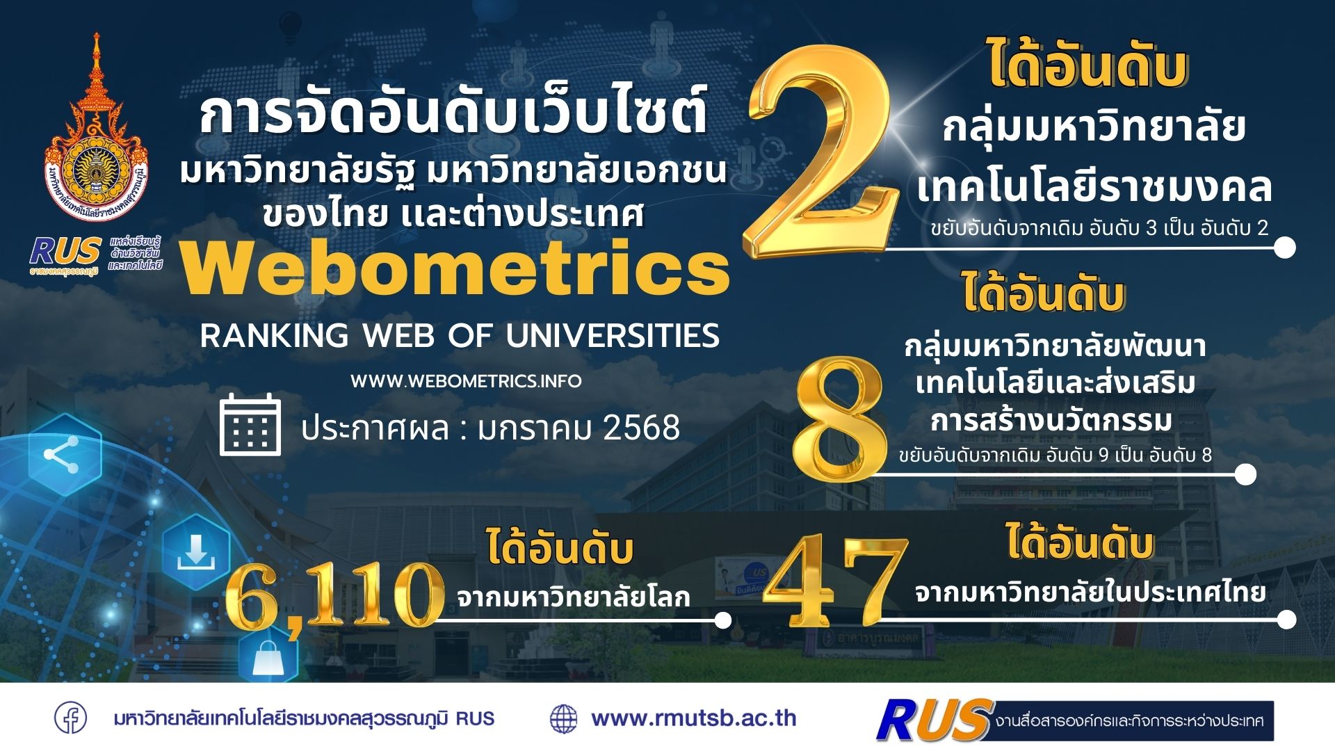 "มทร.สุวรรณภูมิ"พุ่งขึ้นอันดับ 2 กลุ่มมหาวิทยาลัยเทคโนโลยีราชมงคล และอันดับ 47 ของไทยใน Webometrics โชว์ศักยภาพเว็บไซต์ก้าวสู่เวทีระดับโลก!