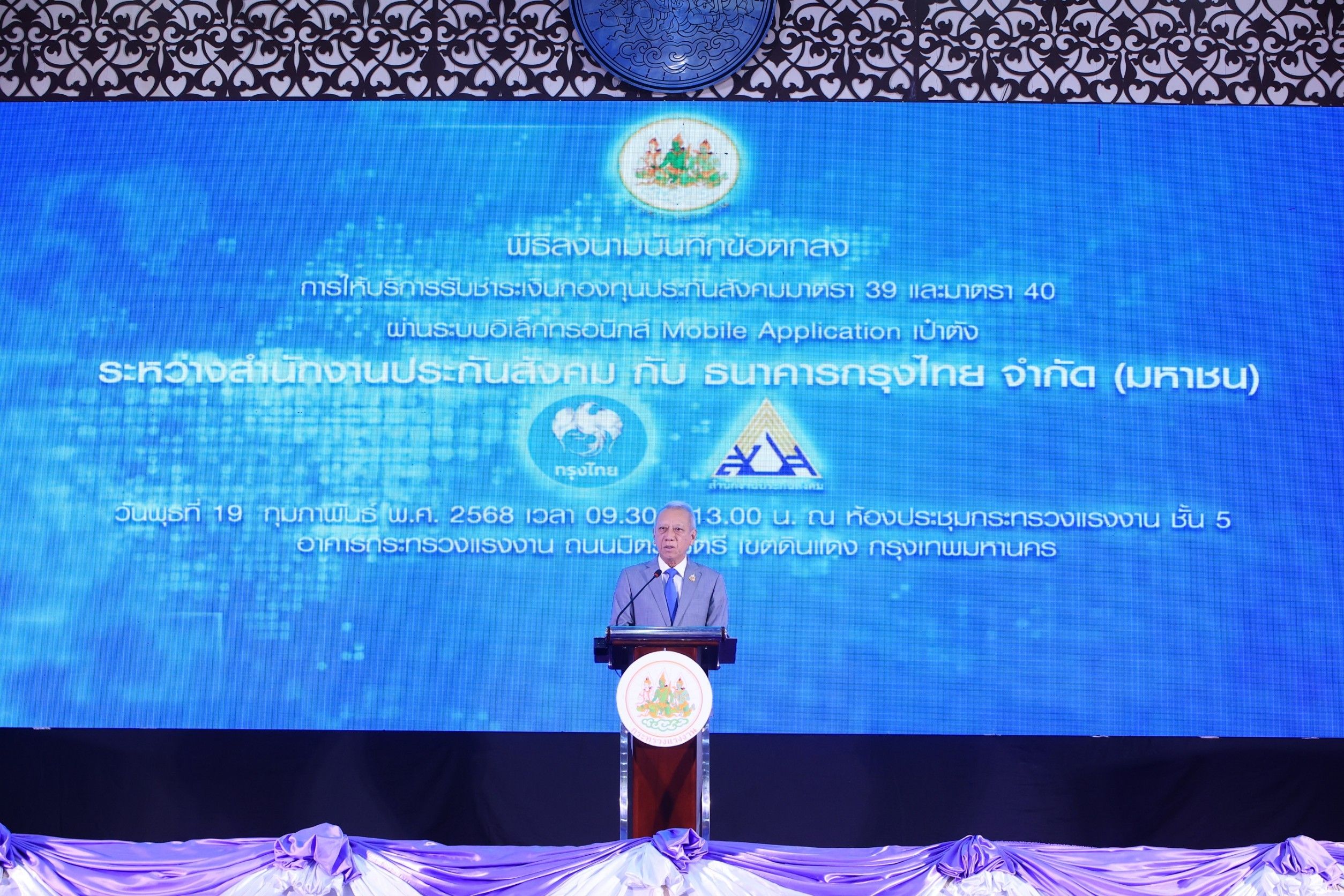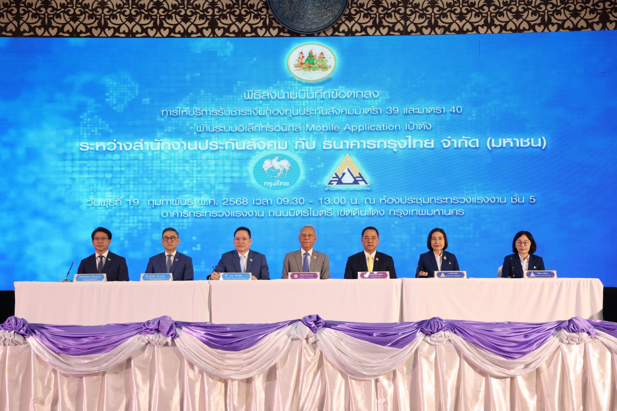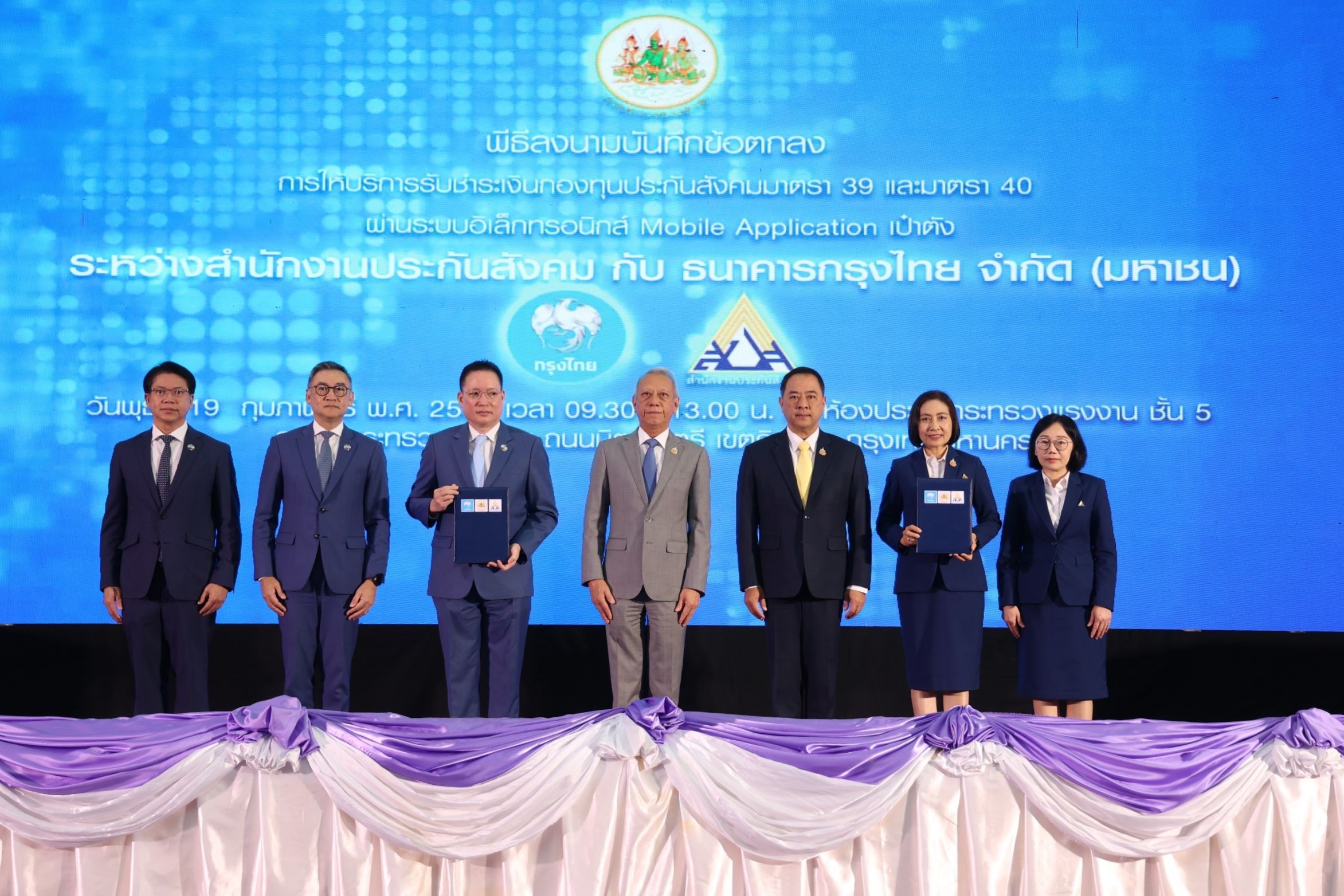 วันที่ 19 ก.พ.นายพิพัฒน์ รัชกิจประการ รัฐมนตรีว่าการกระทรวงแรงงาน เป็นประธานในพิธีลงนามบันทึกข้อตกลงระหว่าง สำนักงานประกันสังคม (สปส.) ลงนามโดยนางมารศรี ใจรังษี เลขาธิการสำนักงานประกันสังคม และ ธนาคารกรุงไทย ลงนามโดย นายผยง ศรีวณิช กรรมการผู้จัดการใหญ่ ธนาคารกรุงไทย จำกัด (มหาชน) โดยมีนายสมาสภ์ ปัทมะสุคนธ์ รองปลัดกระทรวงแรงงาน นายกิตติพัฒน์ เพียรธรรม ผู้บริหารสายงาน สายงานธุรกิจภาครัฐ นายธวัชชัย ชีวานนท์ ประธานผู้บริหาร Product & Business Solutions นางวิไลพร วงษ์อัยรา ผู้อำนวยการกองบริหารการเงินและการบัญชี ร่วมเป็นสักขีพยาน เพื่อเปิดให้บริการ ชำระเงินสมทบกองทุนประกันสังคมมาตรา 39 และมาตรา 40 ผ่านแอปพลิเคชัน “เป๋าตัง” เพิ่มความสะดวกให้แก่ผู้ประกันตน ลดภาระค่าใช้จ่าย และตอบโจทย์ไลฟ์สไตล์ยุคดิจิทัล