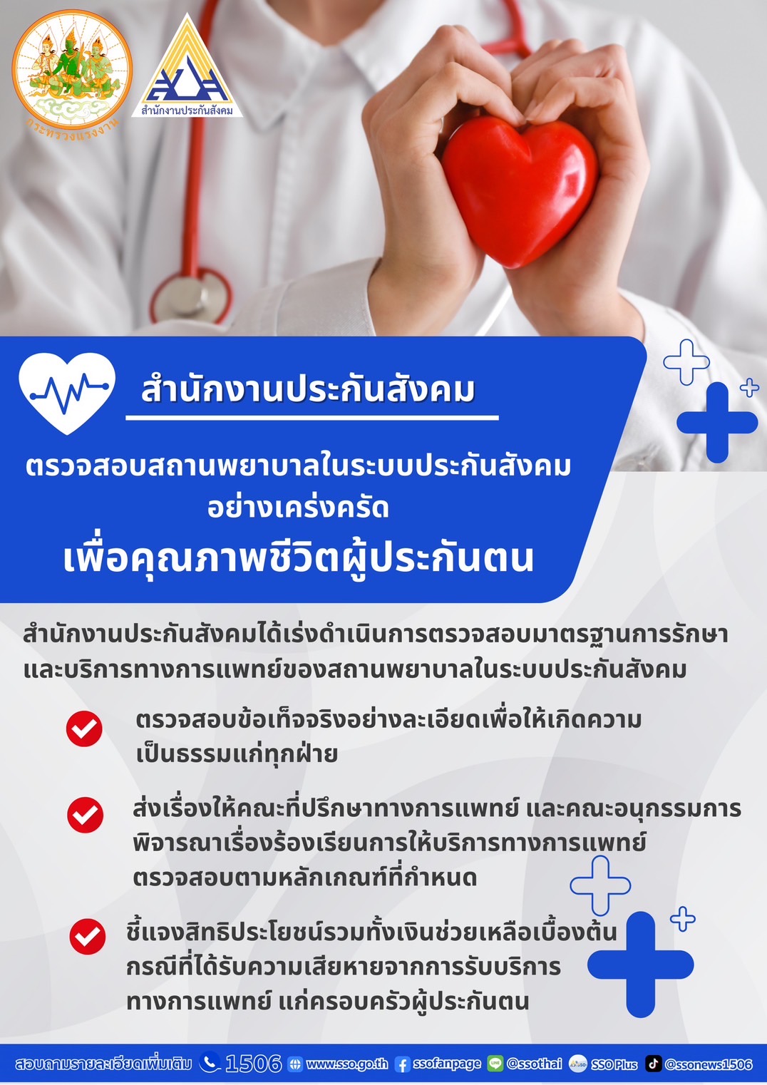 สปส. ชี้แจงการให้บริการทางการแพทย์ พร้อมตรวจสอบสถานพยาบาลในระบบประกันสังคมอย่างเคร่งครัด เพื่อคุณภาพชีวิตผู้ประกันตน