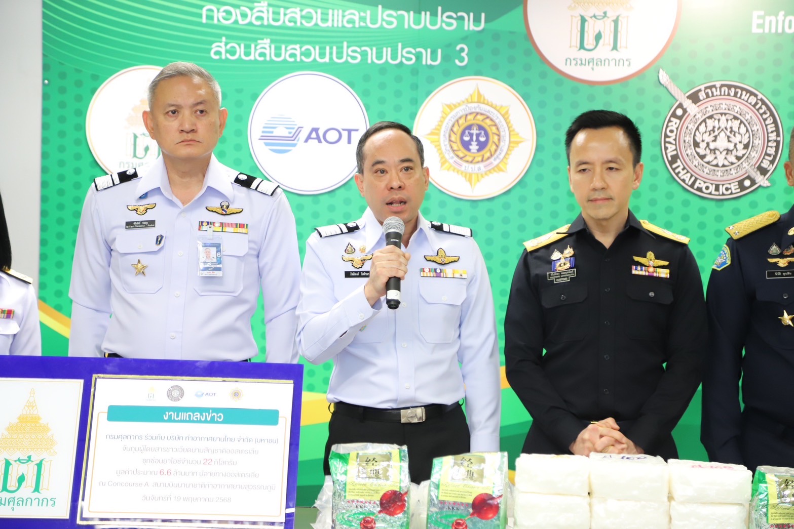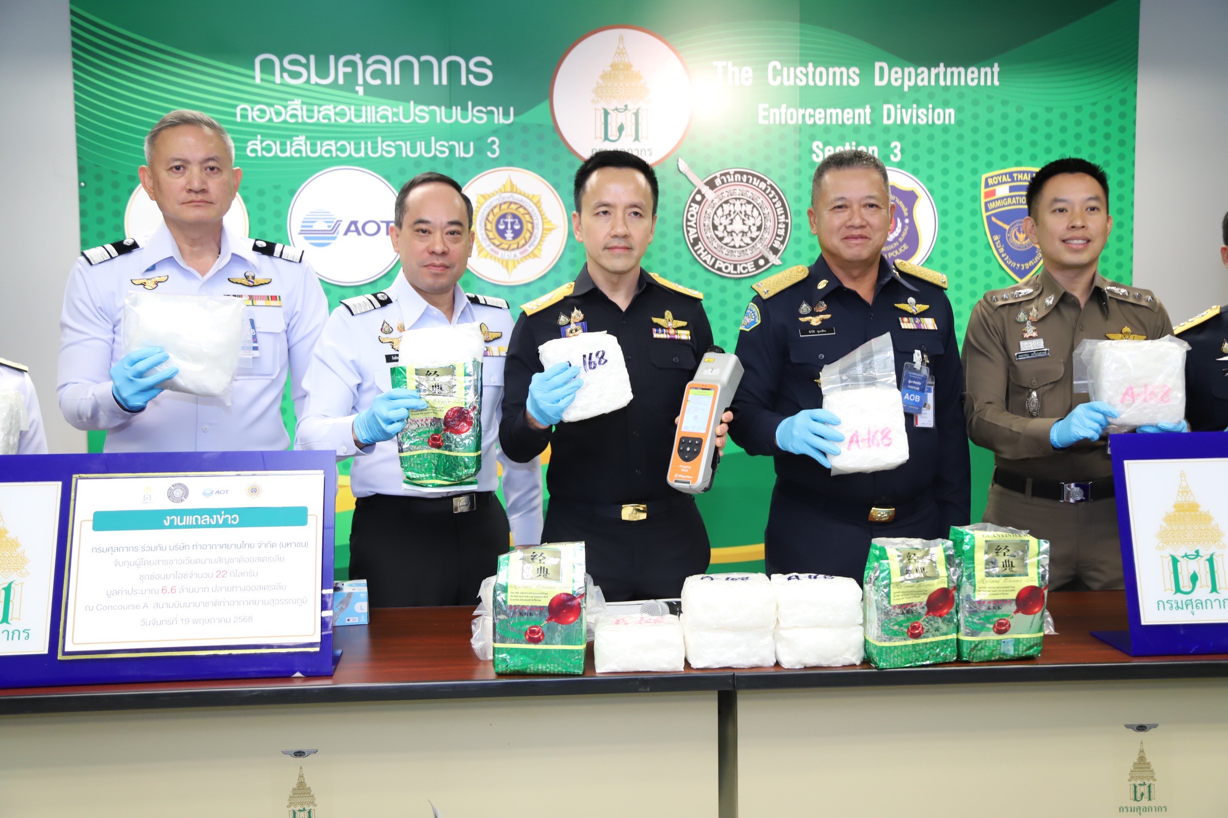เมื่อเวลา 11.30 น. วันที่ 19 พ.ค. 2568 ท่าอากาศยานสุวรรณภูมิร่วมกับศูนย์ปฏิบัติการเฉพาะกิจป้องกัน และปราบปรามยาเสพติดในพื้นที่ท่าอากาศยานและคลังสินค้า (ฉก.333) กรมศุลกากร และหน่วยงานที่เกี่ยวข้อง แถลงข่าวผลการปฏิบัติการร่วมกัน ในการจับกุมผู้โดยสารสัญชาติออสเตรเลีย พยายามส่งออกเมทแอมเฟตามีน (ไอซ์) มูลค่ากว่า 6.6 ล้านบาท (มูลค่าปลายทางประมาณ 23 ล้านบาท) โดยมีนายกิตติพงศ์ กิตติขจร ผู้อำนวยการ ท่าอากาศยานสุวรรณภูมิ นายพันธ์ทอง ลอยกุลนันท์ ที่ปรึกษาด้านการพัฒนาและบริหารการจัดเก็บภาษี กรมศุลกากร พลอากาศตรีนิวัติ พูนสิน ผู้บังคับทหารอากาศดอนเมือง ผู้แทน ฉก.333 นายพีรพงศ์ รำพึงจิตต์ ผู้อำนวยการส่วนปฏิบัติการ สกัดกั้นยาเสพติดท่าอากาศยานและท่าเรือ พ.ต.อ.ทองรชฎ เหรียญสุวงษ์ ผู้กำกับสถานีตำรวจภูธร ท่าอากาศยาน สุวรรณภูมิ และพ.ต.ท.ภัทราดร ภิรมย์ภู่ รองผู้กำกับการสืบสวนปราบปราม กองบังคับการตรวจคนเข้าเมือง 2 ร่วมแถลงข่าว ที่อาคารเทียบเครื่องบิน Concourse A ท่าอากาศยานสุวรรณภูมิ (ทสภ.)