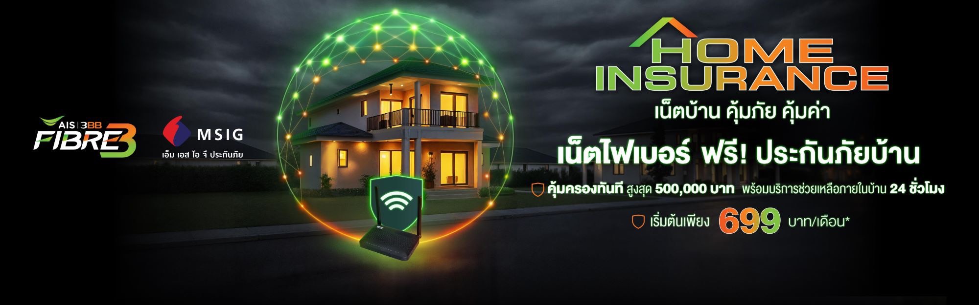 MORE HAPPINESS – มอบความสุข และความอุ่นใจที่มากกว่า เติมเต็มคุณภาพชีวิตและความอุ่นใจให้ทุกครอบครัว ทุกบ้าน ด้วยแพ็กเกจอินเทอร์เน็ตความเร็วสูงพร้อมความคุ้มครองที่อยู่อาศัยแบบครบวงจรกับ AIS 3BB FIBRE3 HOME INSURANCE สมัครแพ็กเกจเริ่มต้นเพียง 699 บาท/เดือน รับฟรี! ประกันภัยจาก MSIG คุ้มครองจากเหตุภัยพิบัติทางธรรมชาติ สูงสุด 500,000 บาท วงเงินครอบคลุมที่อยู่อาศัยจากโจกรรม สูงสุด 100,000 บาท วงเงินครอบคลุมทรัพย์สินส่วนบุคคล และชดเชยค่าใช้จ่ายในการดับเพลิง สูงสุดอย่างละ 50,000 บาท รับความช่วยเหลือเหตุฉุกเฉินในบ้าน 24 ชั่วโมง 1 ครั้งต่อปีพร้อมรับความคุ้มครองประกันที่อยู่อาศัยทันที ไม่ต้องรอลงทะเบียนรับความช่วยเหลือเหตุฉุกเฉินในบ้าน 1 ครั้งต่อปี