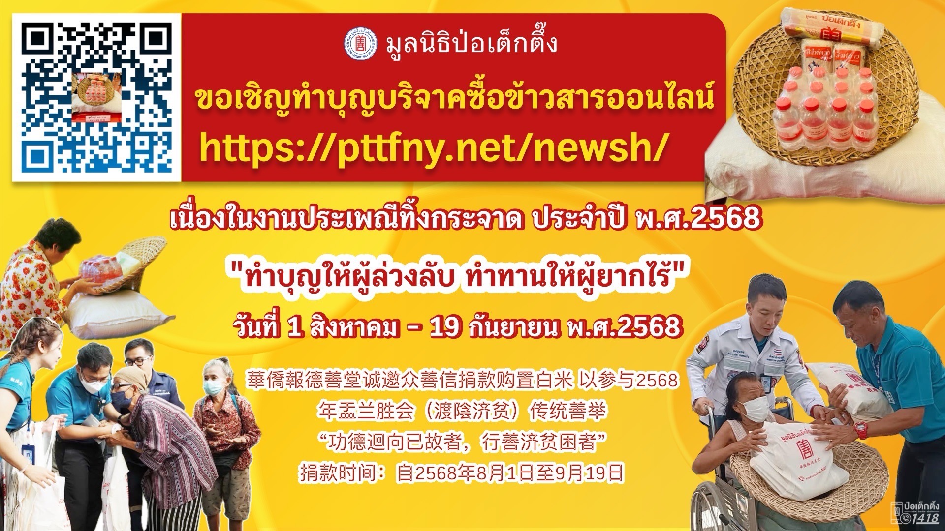 ระหว่างวันที่ 1 ส.ค.- 19 ก.ย.68 มูลนิธิป่อเต็กตึ๊ง โดยนายวิเชียร เตชะไพบูลย์ ประธานกรรมการมูลนิธิฯ ขอเชิญผู้มีจิตศรัทธาร่วมงานมหาบุญ มหากุศล ในประเพณีทิ้งกระจาดงานบุญประจำปีที่ยิ่งใหญ่ ที่ผู้มีจิตศรัทธาจะทำบุญบริจาคชุดข้าวสารอุทิศส่วนกุศลให้ผู้ล่วงลับทั้งที่เป็นญาติและไม่ใช่ญาติ พร้อมกับได้ทำทานให้ผู้ยากไร้ โดยผู้มีจิตศรัทธา สามารถร่วมทำบุญได้ 2 ช่องทาง ดังนี้ 1.ร่วมสักการะหลวงปู่ไต้ฮง และทำบุญบริจาคข้าวสารได้ที่ มูลนิธิป่อเต็กตึ๊ง พลับพลาไชย กรุงเทพฯ 2.ทำบุญผ่านเว็บไซต์ทิ้งกระจาดออนไลน์: https://pttfny.net/newsh