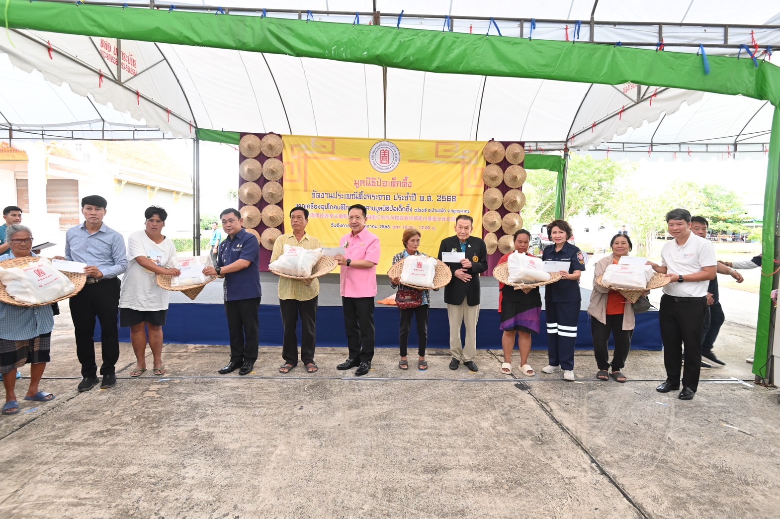 โดยในปีนี้จัดเพิ่มขึ้นกว่าปีที่ผ่านมา ทั้งชุดเครื่องอุปโภค-บริโภคและค่าพาหนะ เพื่อเป็นการช่วยเหลือผู้ยากไร้ สอดรับกับปริมาณผู้ที่มารอรับและค่าครองชีพในปัจจุบันที่เพิ่มขึ้น โดยสิ่งของที่แจกประกอบด้วย ข้าวสาร บะหมี่กึ่งสำเร็จรูป ปลากระป๋อง น้ำปลา น้ำมันพืช ขนม และเสื้อผ้า บรรจุถุงผ้ามูลนิธิฯ โดยมีนายนริศ นิรามัยวงศ์ ผู้ว่าราชการจังหวัดสมุทรสาคร เป็นประธานในพิธี พร้อมด้วยมูลนิธิการกุศลสมุทรสาคร และผู้แทนหน่วยงานภาครัฐต่างๆ ร่วมในพิธี ที่สุสานมูลนิธิป่อเต็กตึ๊ง ต.โรงเข้ อ.บ้านแพ้ว จ.สมุทรสาคร