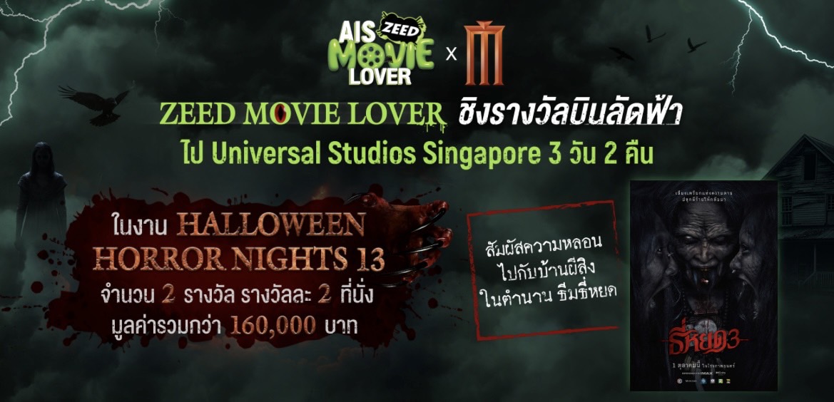 AIS ZEED 5G ตอกย้ำความเป็นผู้นำ “Teen Entertainment Ecosystem” ด้วยการยกระดับประสบการณ์ดูหนังไปอีกขั้น นำโดยนางเบญจพร กำเพ็ชร หัวหน้าสำนักการตลาดกลุ่มลูกค้าพรีเพด ร่วมกับ เมเจอร์ ซีนีเพล็กซ์ โดยนายสุรเชษฐ์ อัศวเรืองอนันต์ รองประธานเจ้าหน้าที่บริหารฝ่ายสื่อโฆษณา บริษัท เมเจอร์ ซีนีเพล็กซ์ กรุ้ป จำกัด (มหาชน) เปิดตัวแคมเปญ “ZEED Movie Lover ฟินทะลุจอ บุก Universal Studios Singapore” ชวนลูกค้าวัยทีนลุ้นฟินทะลุจอ บินลัดฟ้ามอบประสบการณ์สุดเอ็กซ์คลูซีฟ สัมผัสความหลอนของบ้านผีสิงจากภาพยนตร์ไทย “ธี่หยด” ในงาน Halloween Horror Nights สวนสนุก Universal Studios ประเทศสิงคโปร์ เชื่อมโยงคอนเทนต์ภาพยนตร์ไทยสู่เวทีระดับโลก