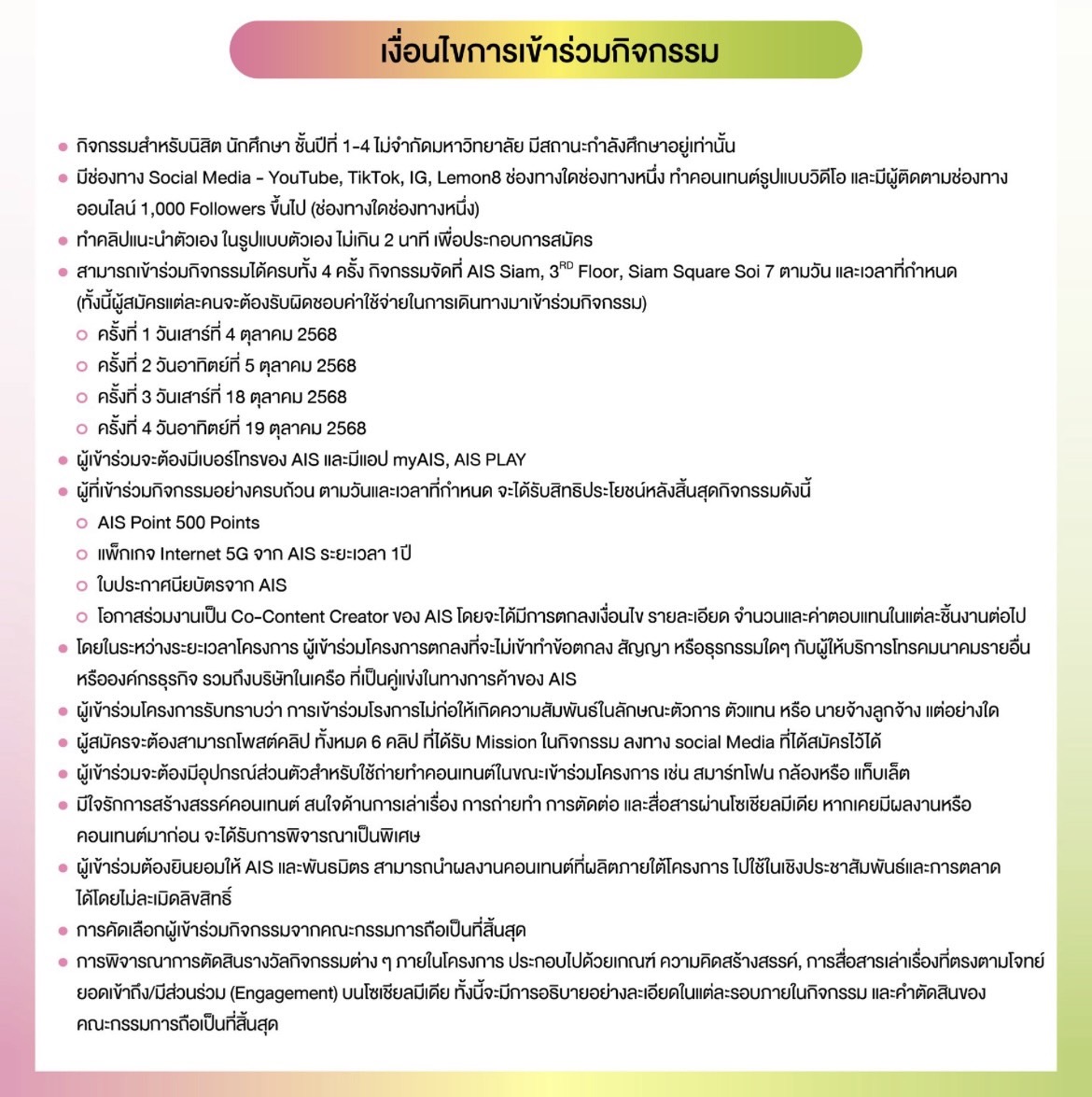 พิเศษสุด! โอกาสครั้งสำคัญสำหรับครีเอเตอร์รุ่นใหม่ ผู้เข้าร่วมทุกคนมีสิทธิ์ลุ้นเป็นผู้ชนะ รับของรางวัลมากมาย ชิงเงินรางวัลมูลค่ารวมกว่า 100,000 บาท พร้อมโอกาสทำงานจริงในฐานะ Co-Content Creator กับ AIS นอกจากนี้ยังจะได้รับ Certificate การเข้าร่วมเวิร์กช็อป สิทธิพิเศษสุดเอ็กซ์คลูซีฟและของรางวัลจากแบรนด์ดังอีกเพียบ