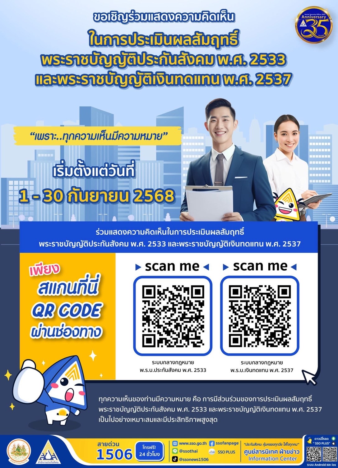 วันที่ 17 ก.ย.นางสาวบุปผา เรืองสุด เลขาธิการสำนักงานประกันสังคม เป็นประธานการประชุมรับฟังความคิดเห็น “การประเมินผลสัมฤทธิ์ของพระราชบัญญัติประกันสังคม พ.ศ. 2533 และพระราชบัญญัติเงินทดแทน พ.ศ. 2537 รวมถึงกฎที่ออกโดยอาศัยอำนาจจากพระราชบัญญัติดังกล่าว” โดยมีคณะกรรมการประกันสังคม คณะกรรมการกองทุนเงินทดแทน คณะอนุกรรมการการประเมินผลสัมฤทธิ์ของกฎหมาย ผู้แทนสภาองค์การนายจ้าง สภาองค์การลูกจ้าง เครือข่ายแรงงานนอกระบบ ตัวแทนสถานพยาบาล นายจ้าง ลูกจ้าง ผู้ประกันตน และผู้บริหารสำนักงานประกันสังคม เข้าร่วมการประชุม ที่โรงแรมทีเค. พาเลซ แอนด์ คอนเวนชั่น กรุงเทพฯ