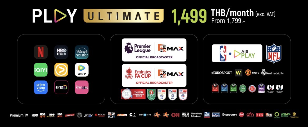 แพ็กเกจ PLAY ULTIMATE+SPORTS รายเดือน ราคา 1,499 บาทต่อเดือน นาน 12 เดือน หลังจากนั้นค่าบริการ 1,799 บาท (ไม่รวม VAT) รวมที่สุดของความบันเทิงและกีฬาครบจบในแพ็กเกจเดียว จัดเต็มช่องพรีเมียมระดับโลกและคอนเทนต์ รวมถึงรายการกีฬาชั้นนำอย่าง พรีเมียร์ลีก, NFL และ NBA ที่สามารถรับชมได้บน AIS PLAY และความบันเทิงจากสตรีมมิงแพลตฟอร์มชั้นนำ ทั้ง, Netflix, HBO Max, Disney+ Hotstar, Prime Video, iQIYI, Viu, WeTV, AIS KARAOKE, Monomax และ oneD สมัครกด *678*1# โทรออก